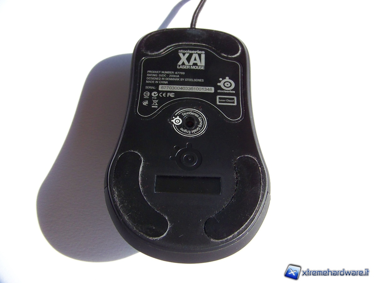 La parte inferiore del mouse è caratterizzata dallo schermo LCD che vedremo in funzione, ovviamente dal laser, dal numero seriale e da 3 alette in teflon che ricoprono il 16% della parte inferiore del mouse stesso, permettendo una elevata scorrevolezza.