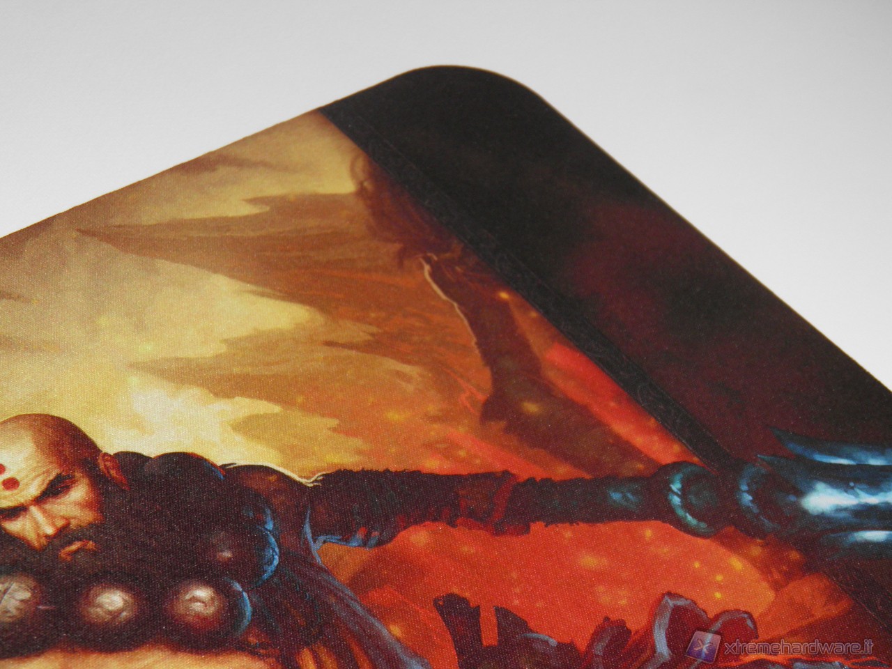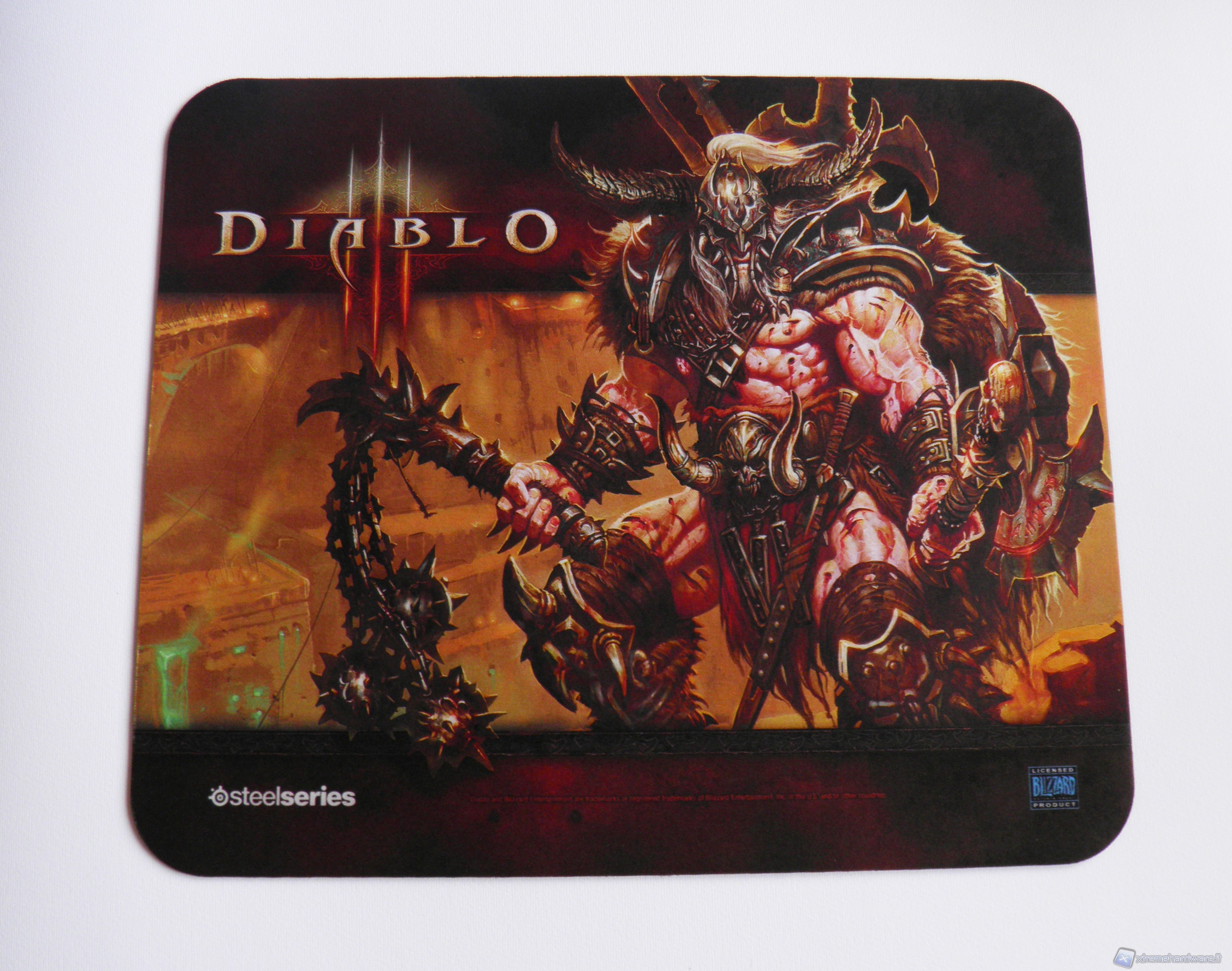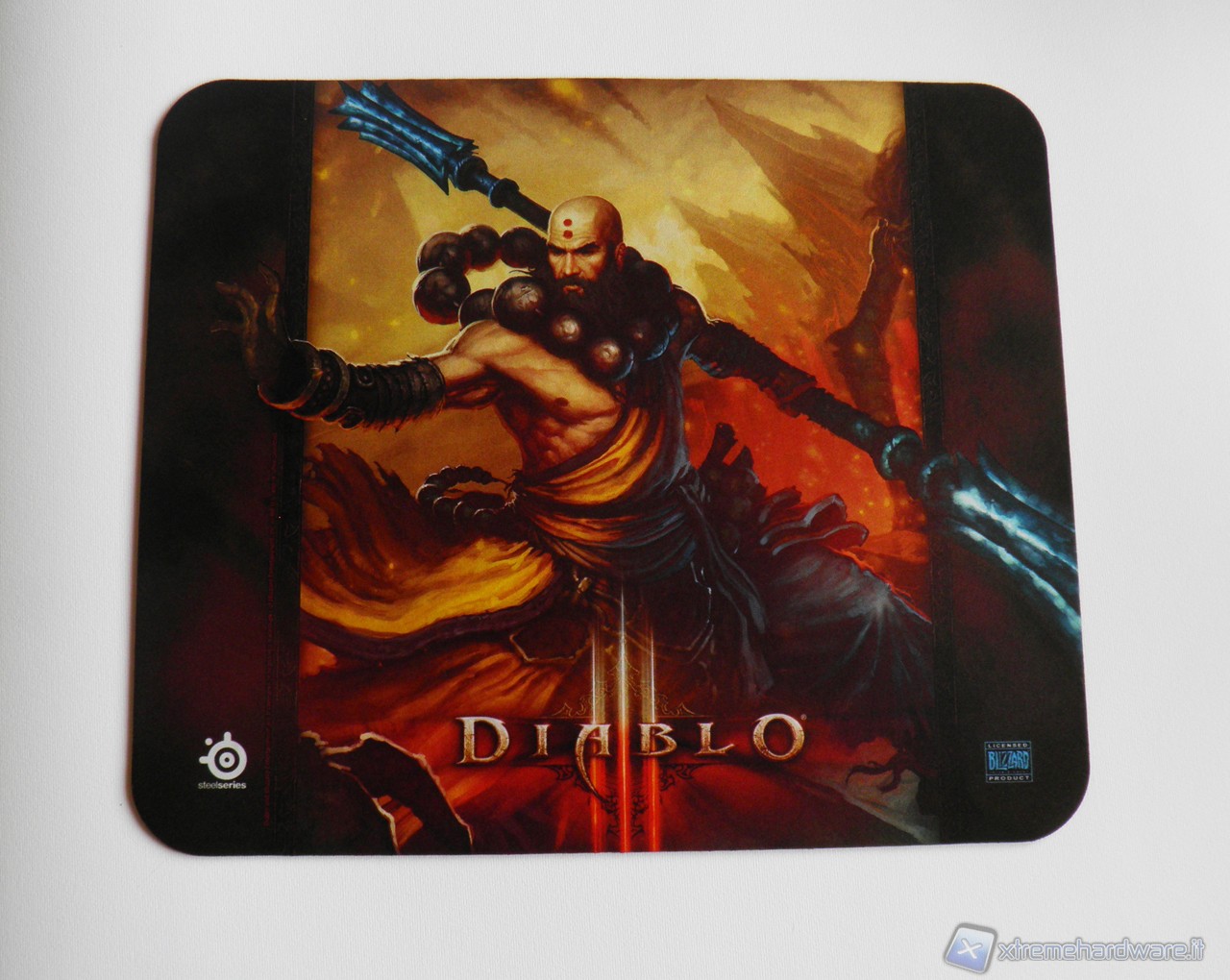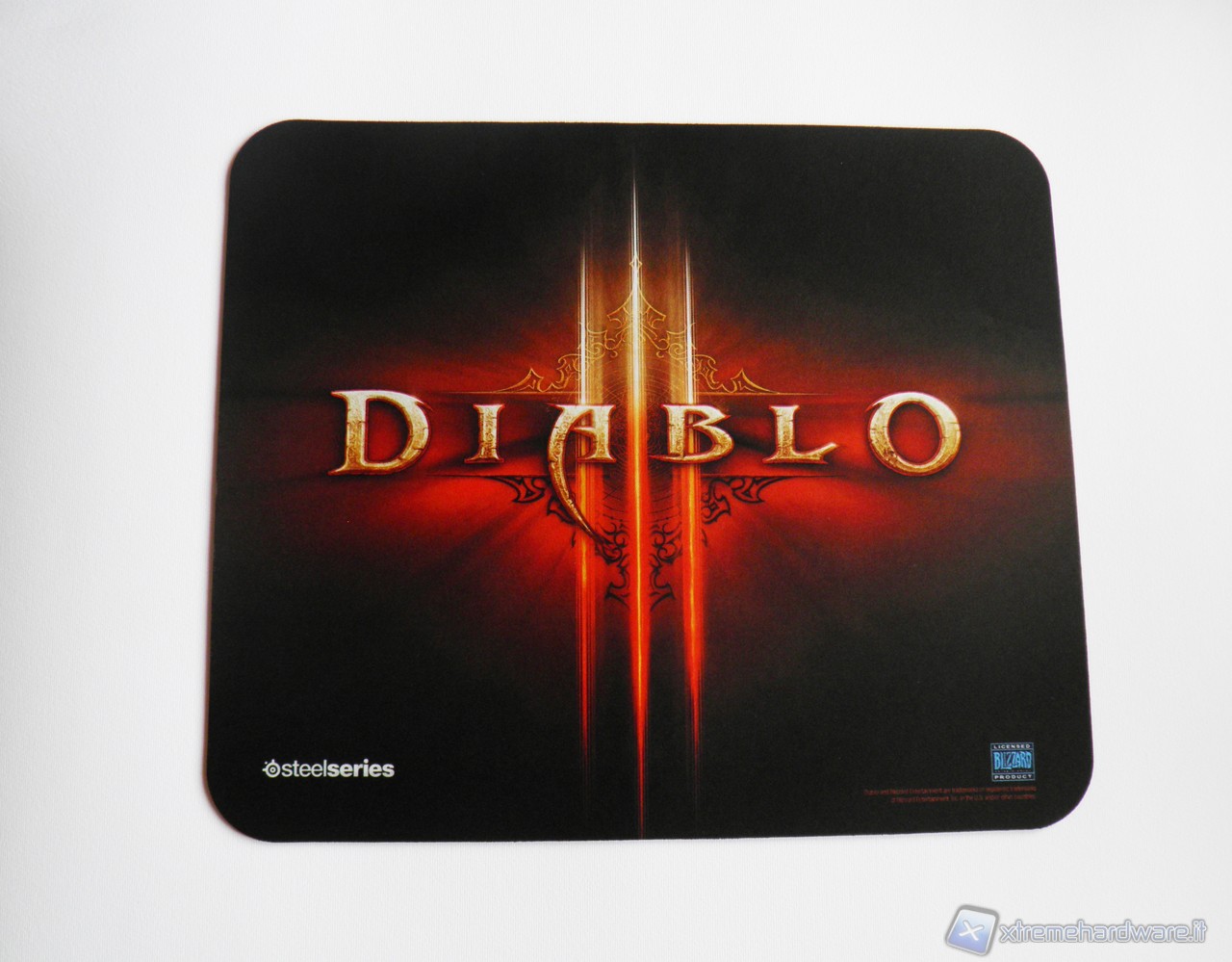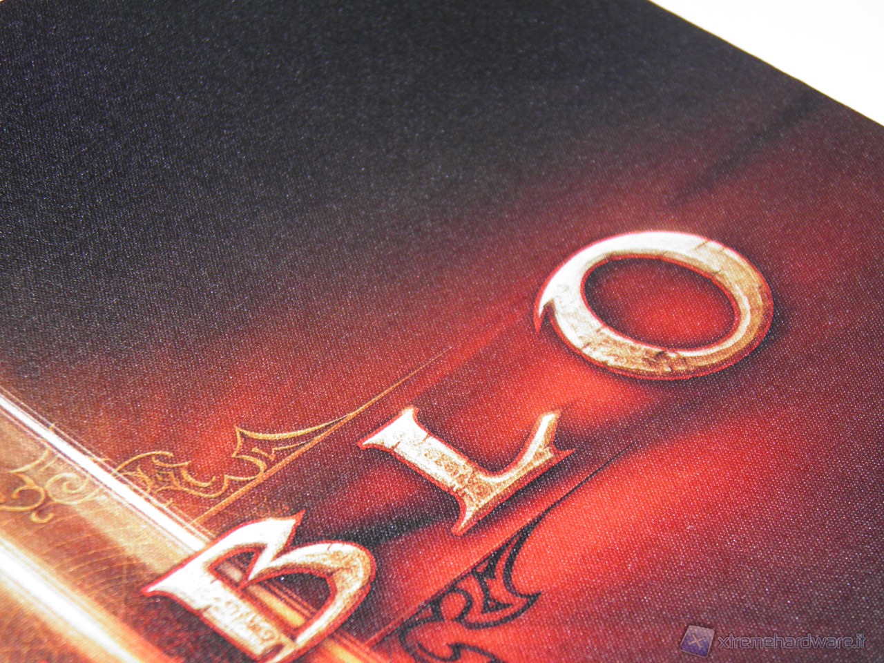 Il primo raffigura il logo di Diablo III. La trama del tessuto di questi mousepad, che costituisce la superficie di scorrimento degli stessi, è molto fine. Questo garantisce un'ottima scorrevolezza del mouse sul tappetino, l'attrito è davvero molto basso rispetto ad altri prodotti dello stesso tipo. Il tessuto della superficie è uguale per tutti e 5 i prodotti di questa recensione.