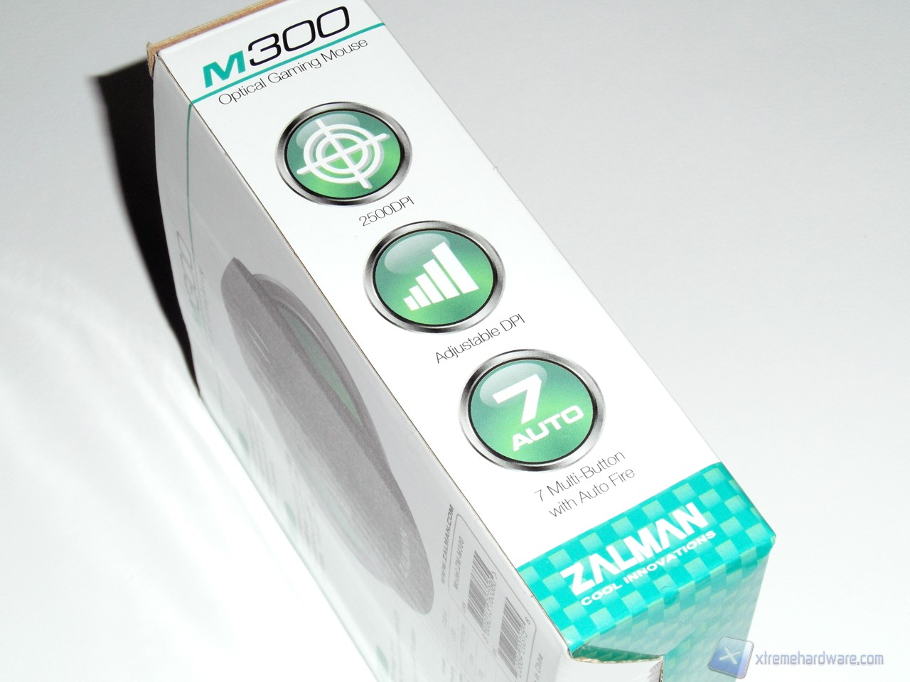 La scatola dello Zalman M300 è decisamente economica, la parte frontale riporta il modello del prodotto e mostra il mouse in una plastica protettiva, mentre le specifiche tecniche sono riportate nella parte posteriore. Vediamo quindi indicato l'utilizzo dell'Avago 5050 e, nella parte bassa, le specifiche tecniche che riportano il peso, il numero di pulsanti, risoluzione massima e lunghezza cavo. Le informazioni sono ridotte all'essenziale, anche in merito alle specifiche del prodotto.