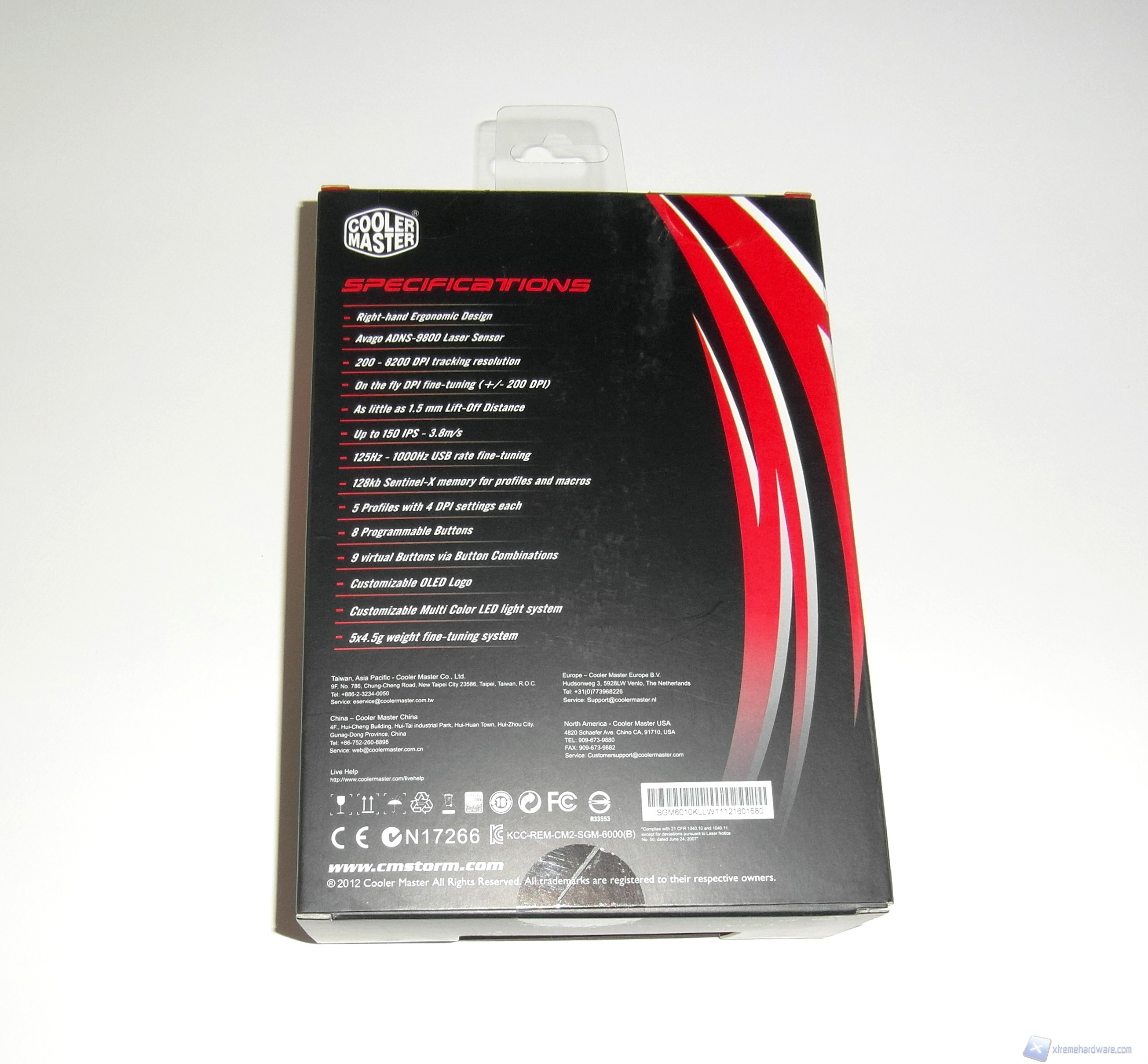 Posteriormente vengono elencate tutte le specifiche tecniche del mouse che abbiamo riportato nella pagina precedente, mentre sul lato sinistro è indicato il sito di Cooler Master per avere informazioni aggiuntive.
