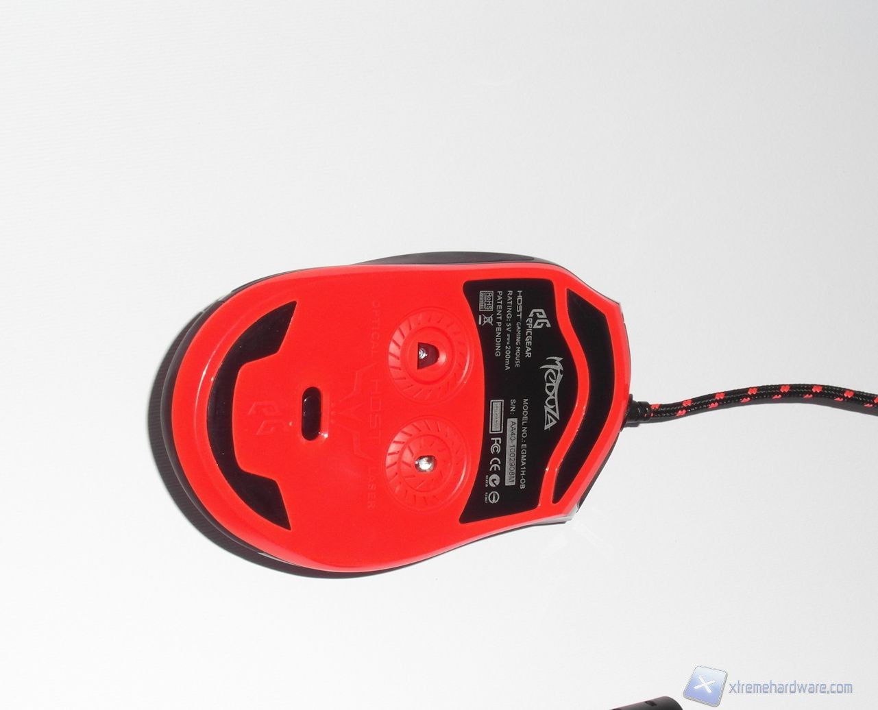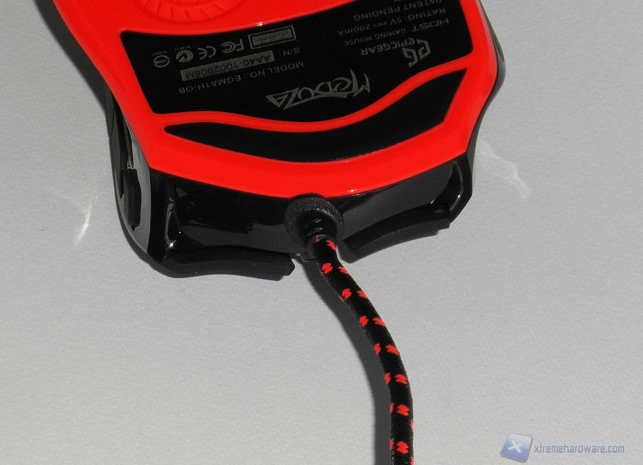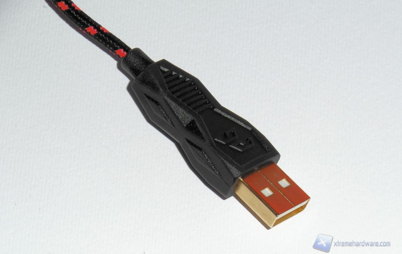 Il cavo, in treccia color nero-arancio, vede alla sua estremità un filtro in ferrite per ridurre i disturbi. Il connettore che lo termina è placcato oro, come per tutti i mouse di fascia alta.