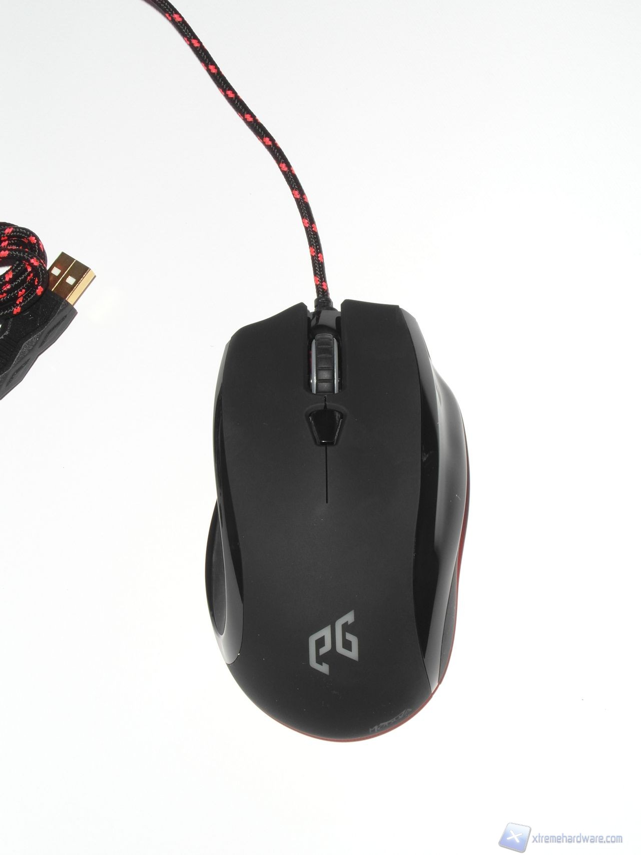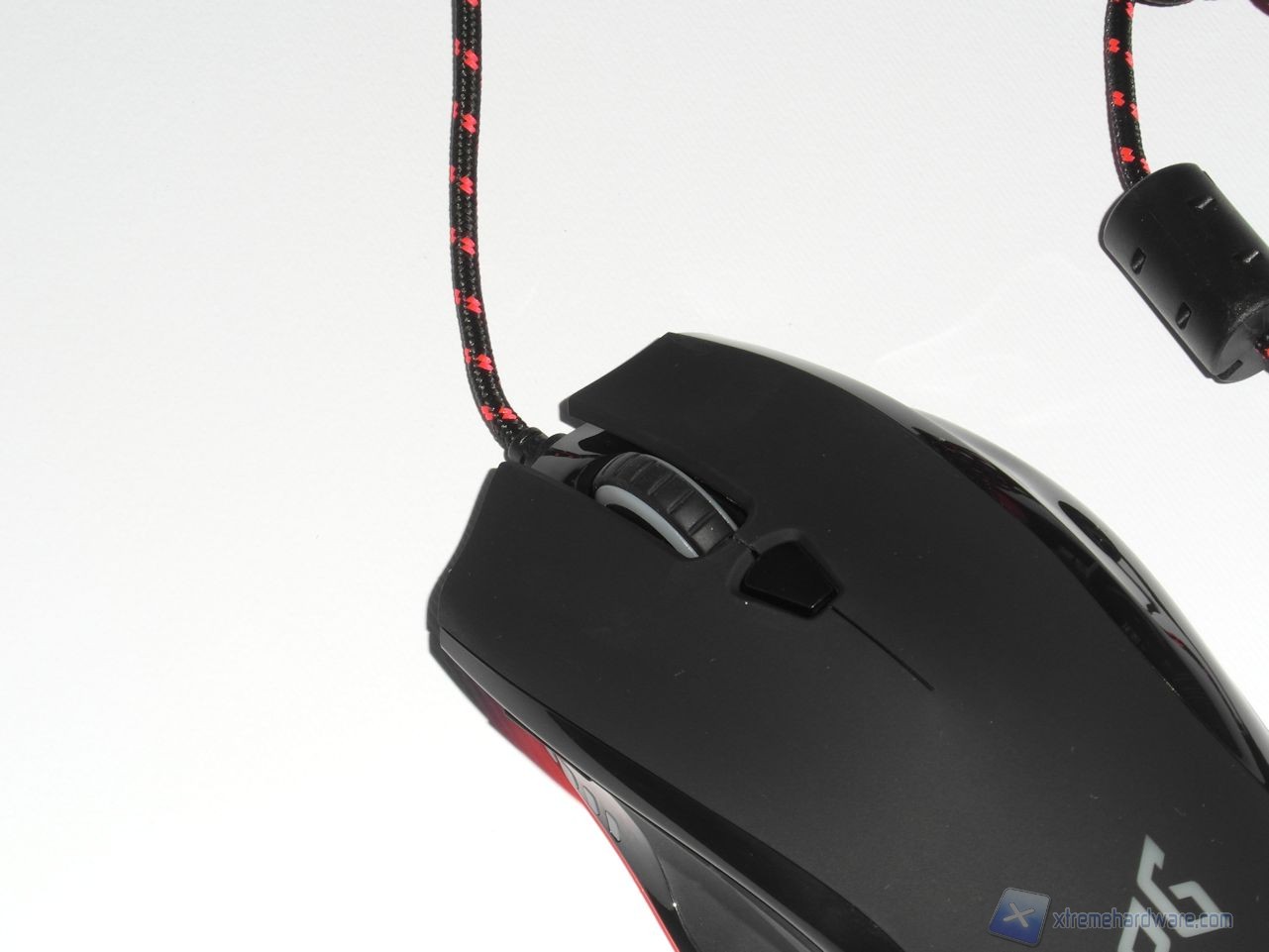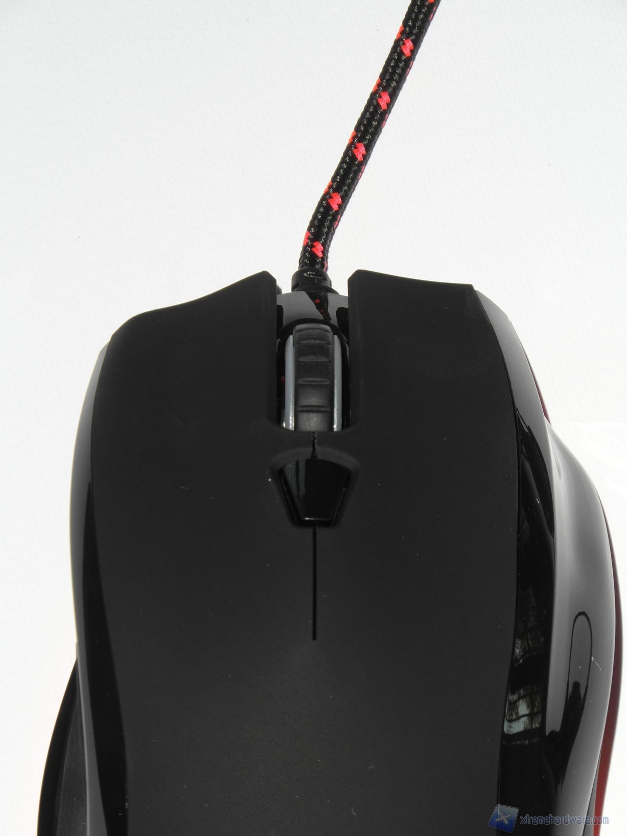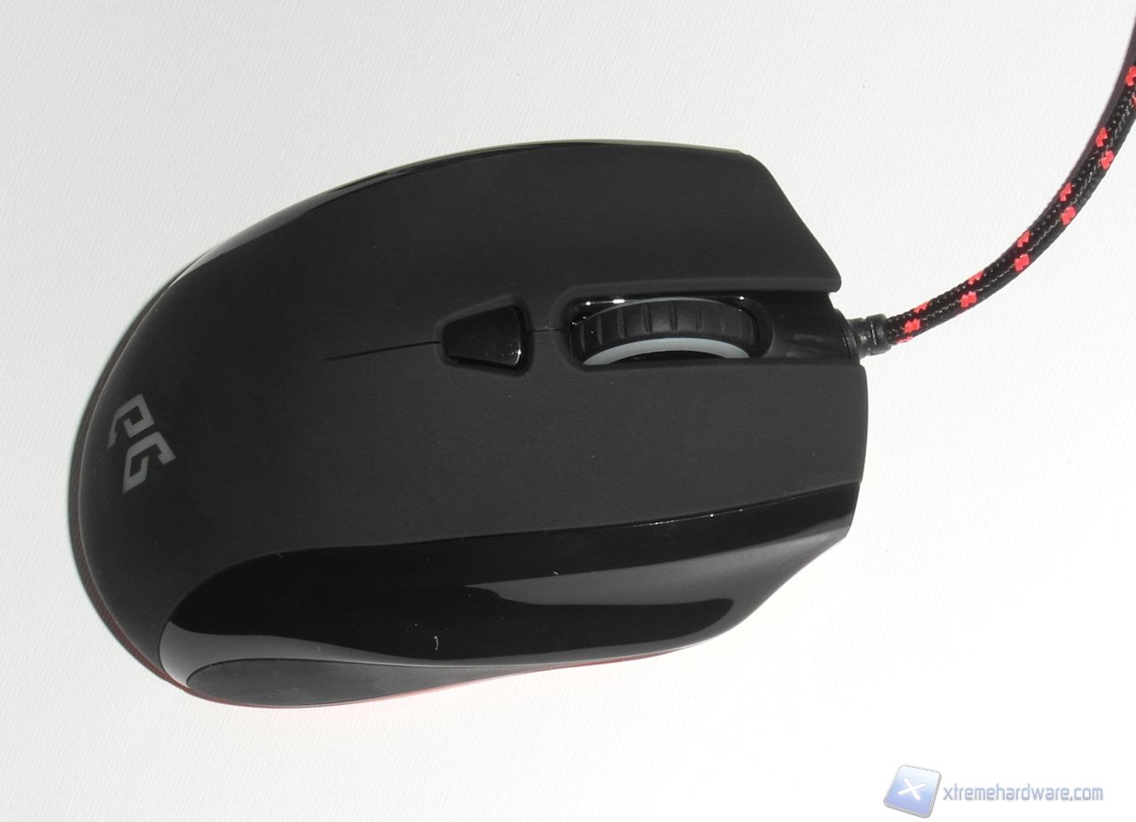 Il lato superiore è realizzato in plastica gommata (soft-touch) per ridurre la sudorazione e migliorare il grip. Possiamo osservare nella parte centrale un pulsante dedicato al controllo della risoluzione del sensore mentre, poco più avanti, è presente lo scroll caratterizzato da un profilo dentellato. Esso offre un'ottima sensazione sotto al dito, il feedback offerto in fase di rotazione è buono, tuttavia gli scatti sono abbastanza ravvicinati; il risultato è comunque decisamente sufficiente a garantire una buona efficacia in gioco.