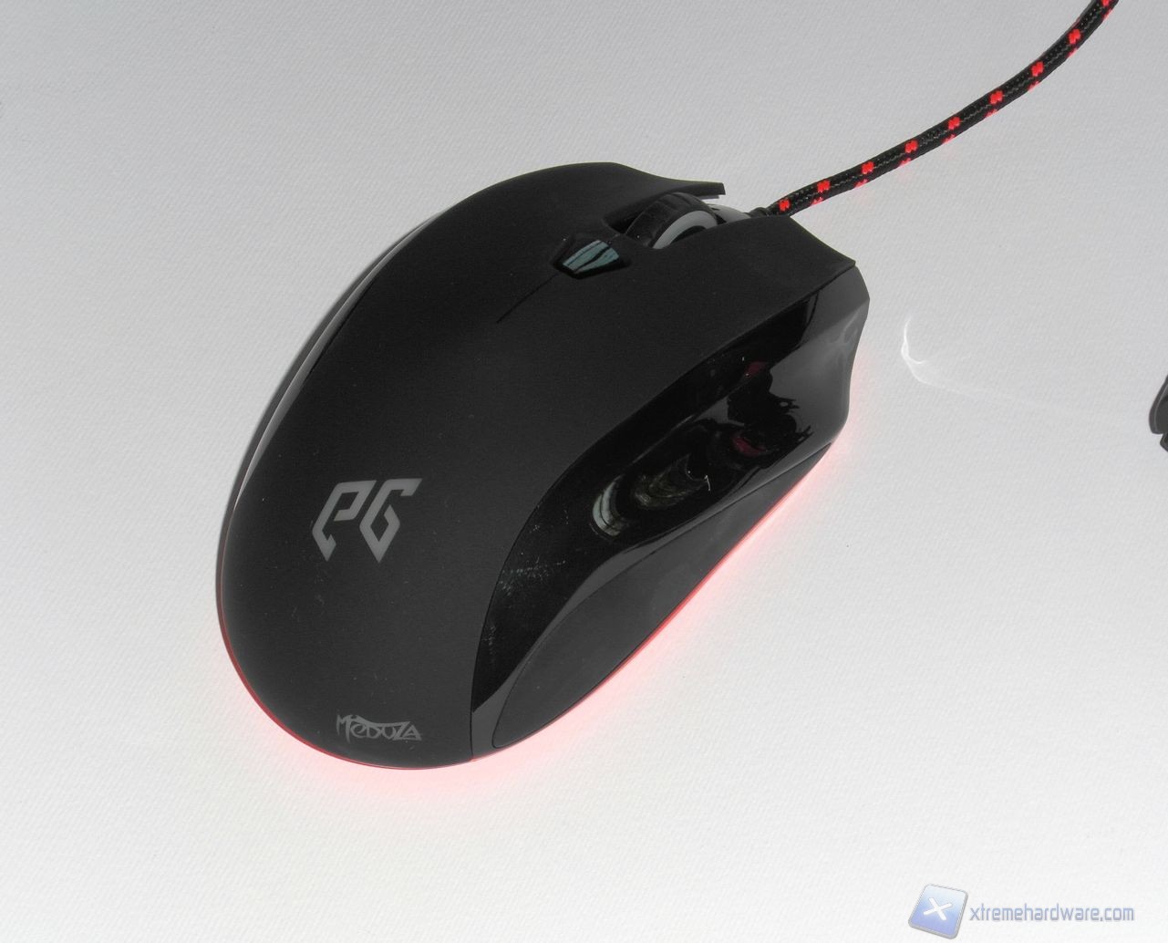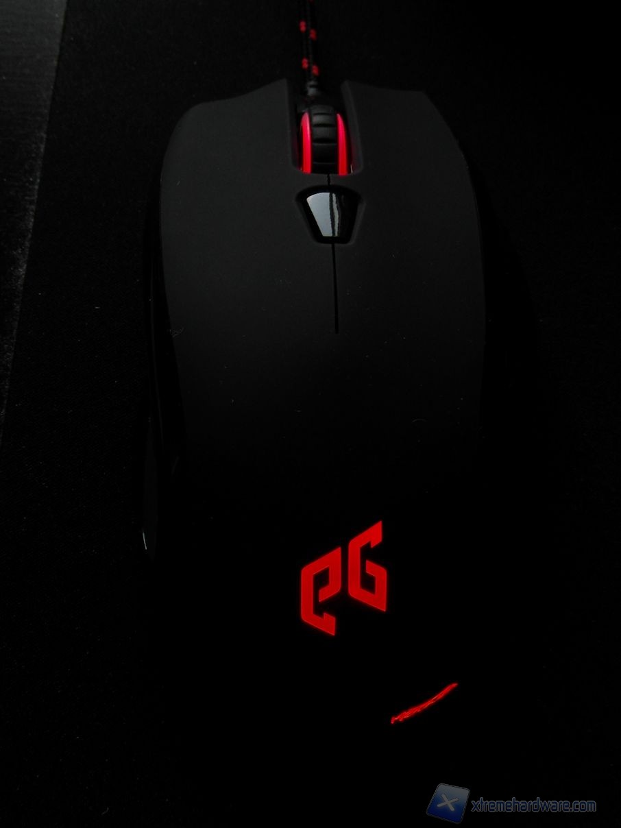 Al buio, il logo posteriore EG e la scritta Meduza si illuminano di un rosso acceso, mentre il colore dello scroll varia a seconda del profilo in uso. Possiamo inoltre osservare, sul lato sinistro del mouse, la barra di 4 LED che indica la risoluzione dei sensori.
