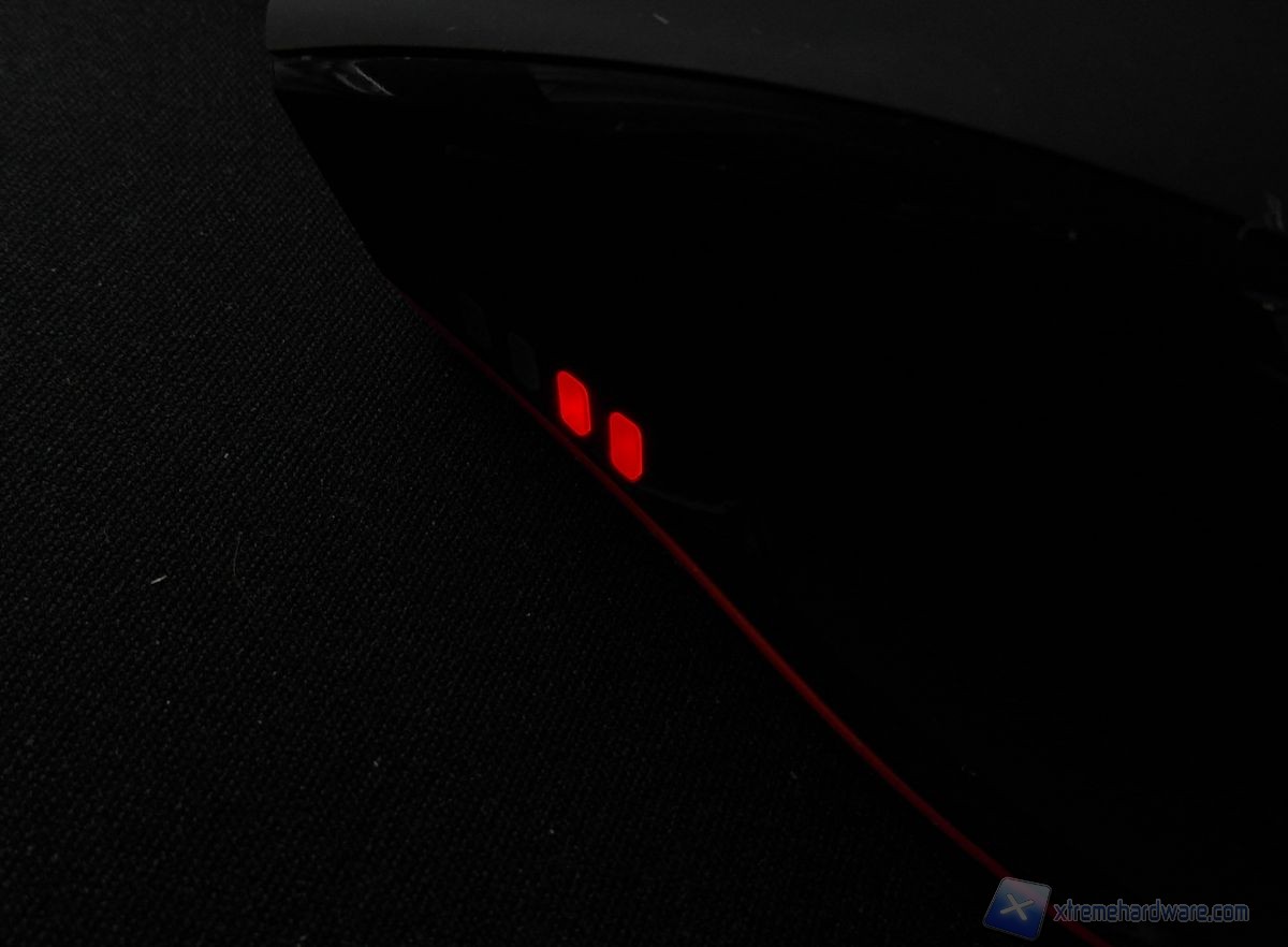Sul lato sinistro è installato un sensore ottico da 3200 dpi, affiancato alla destra da quello laser da 6030 dpi. Subito sotto possiamo osservare lo switch che permette di selezionare quale sensore usare tra i due o la modalità HDST. I mousefeet in teflon posti alle due estremità garantiscono il minor attrito possibile con il mousepad.