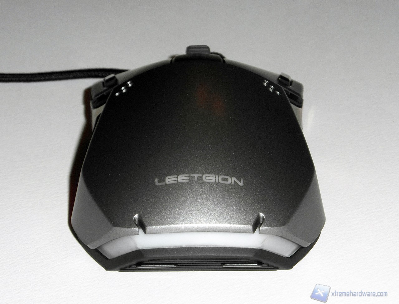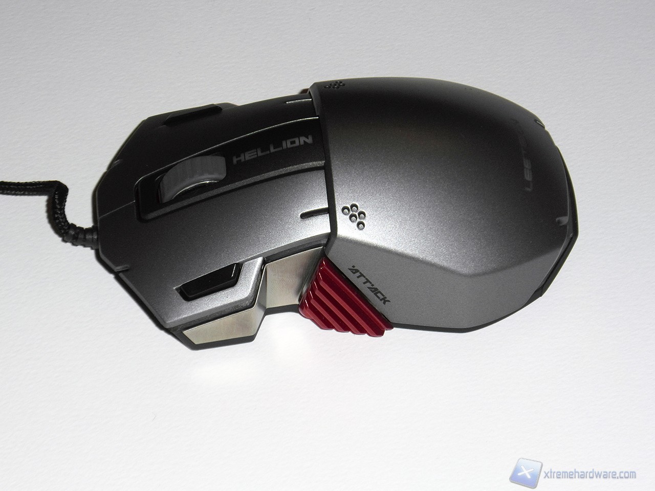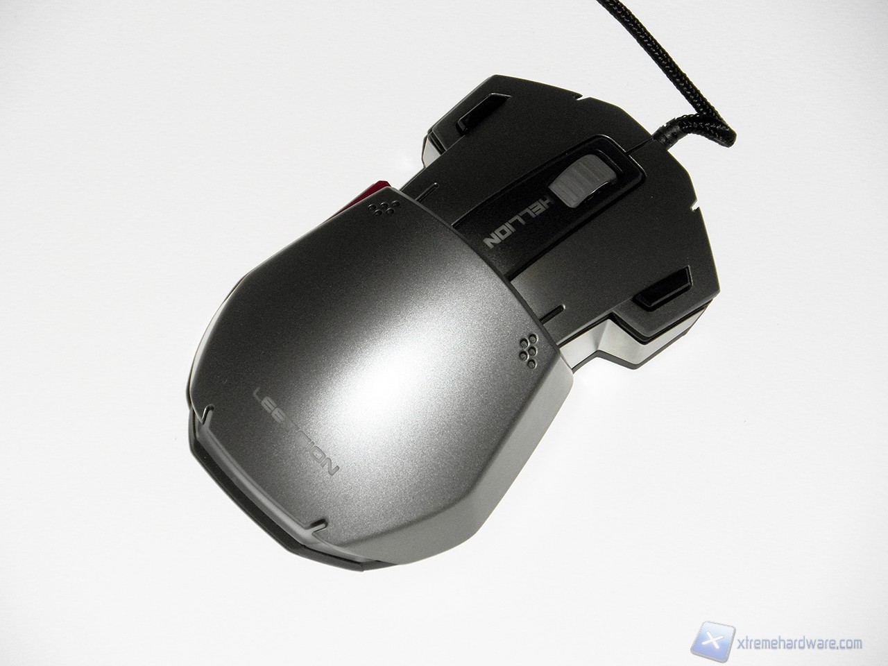 La forma del Leetgion Hellion è davvero particolare e ci ricorda vagamente la forma di uno squalo martello. La parte superiore è realizzata in plastica verniciata di colore grigio metallizzato; nella parte anteriore troviamo ben quattro pulsanti (dotati si micro switch Omron) più lo scroll centrale, rivestito di gomma, subito davanti alla scritta Hellion. I quattro pulsanti anteriori sono divisi tra i due principali e i due secondari neri, installati verso l'esterno del mouse.