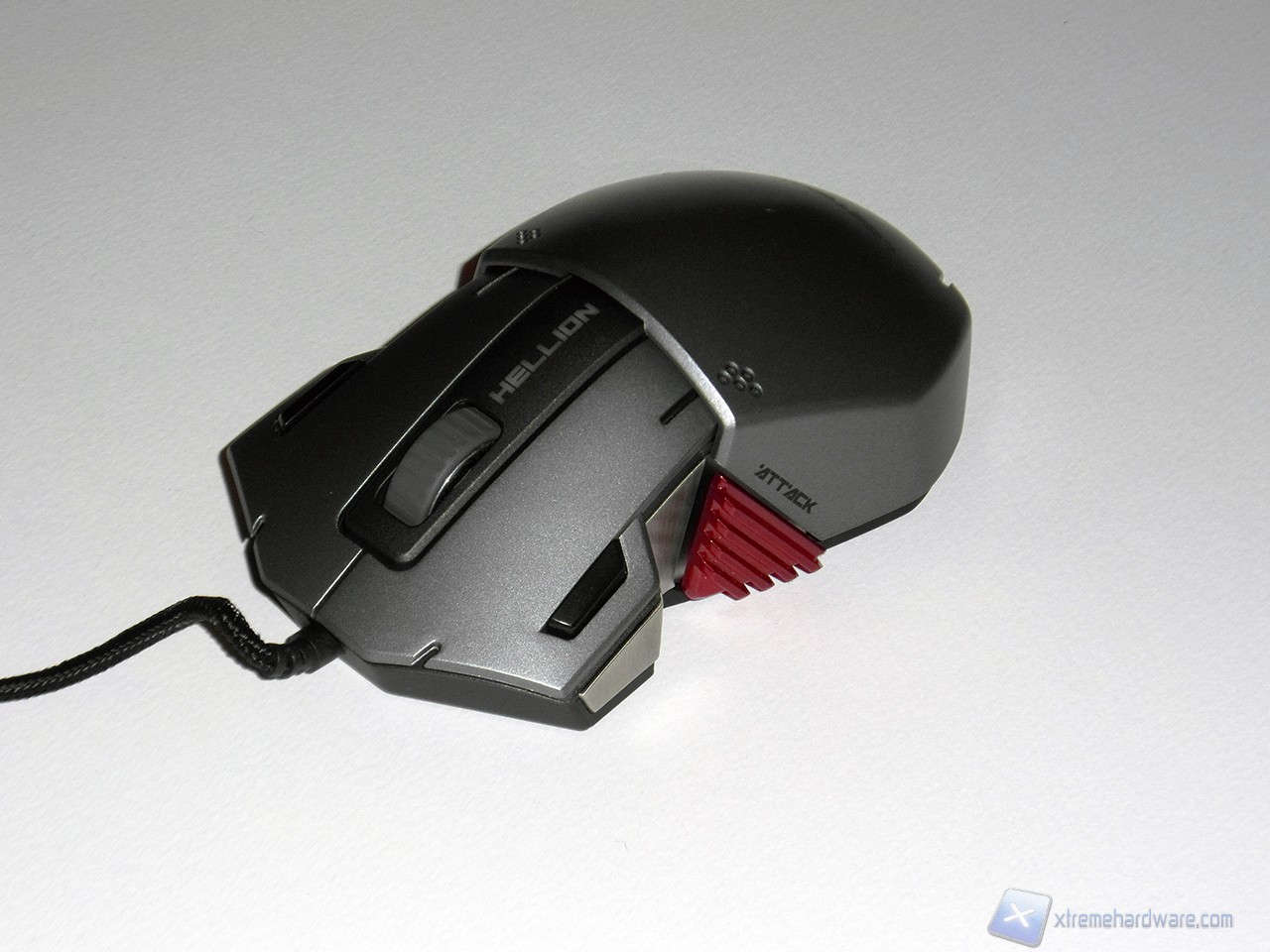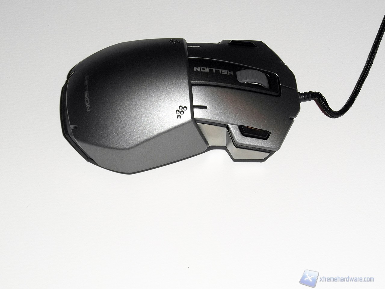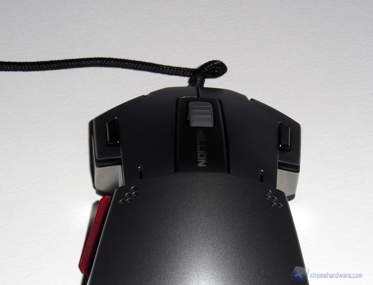 La forma del Leetgion Hellion è davvero particolare e ci ricorda vagamente la forma di uno squalo martello. La parte superiore è realizzata in plastica verniciata di colore grigio metallizzato; nella parte anteriore troviamo ben quattro pulsanti (dotati si micro switch Omron) più lo scroll centrale, rivestito di gomma, subito davanti alla scritta Hellion. I quattro pulsanti anteriori sono divisi tra i due principali e i due secondari neri, installati verso l'esterno del mouse.