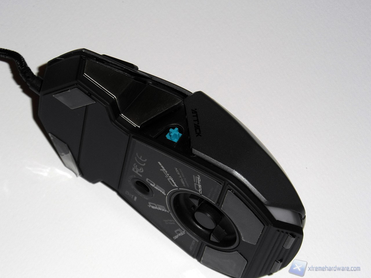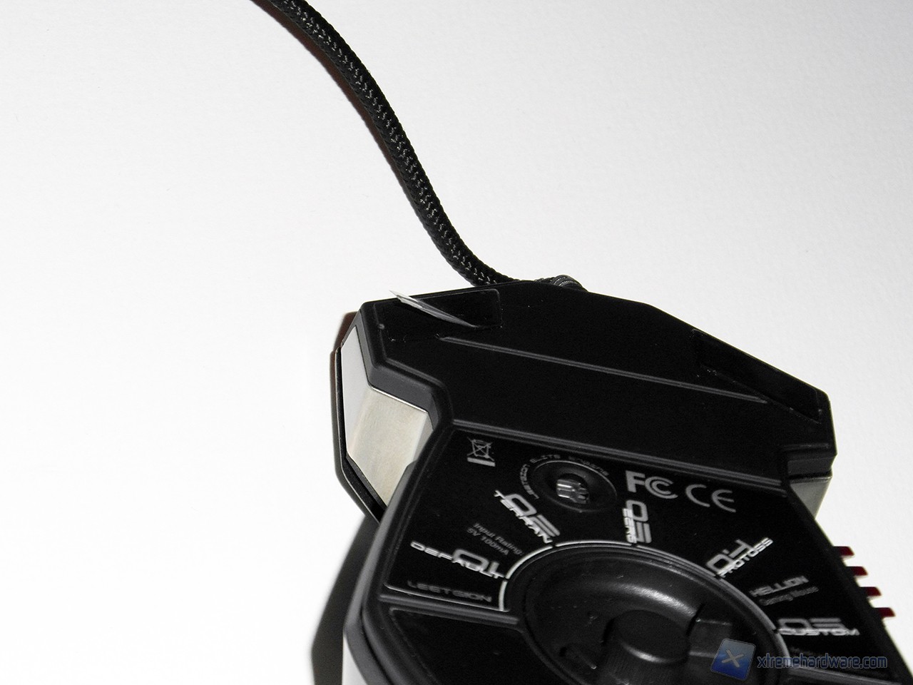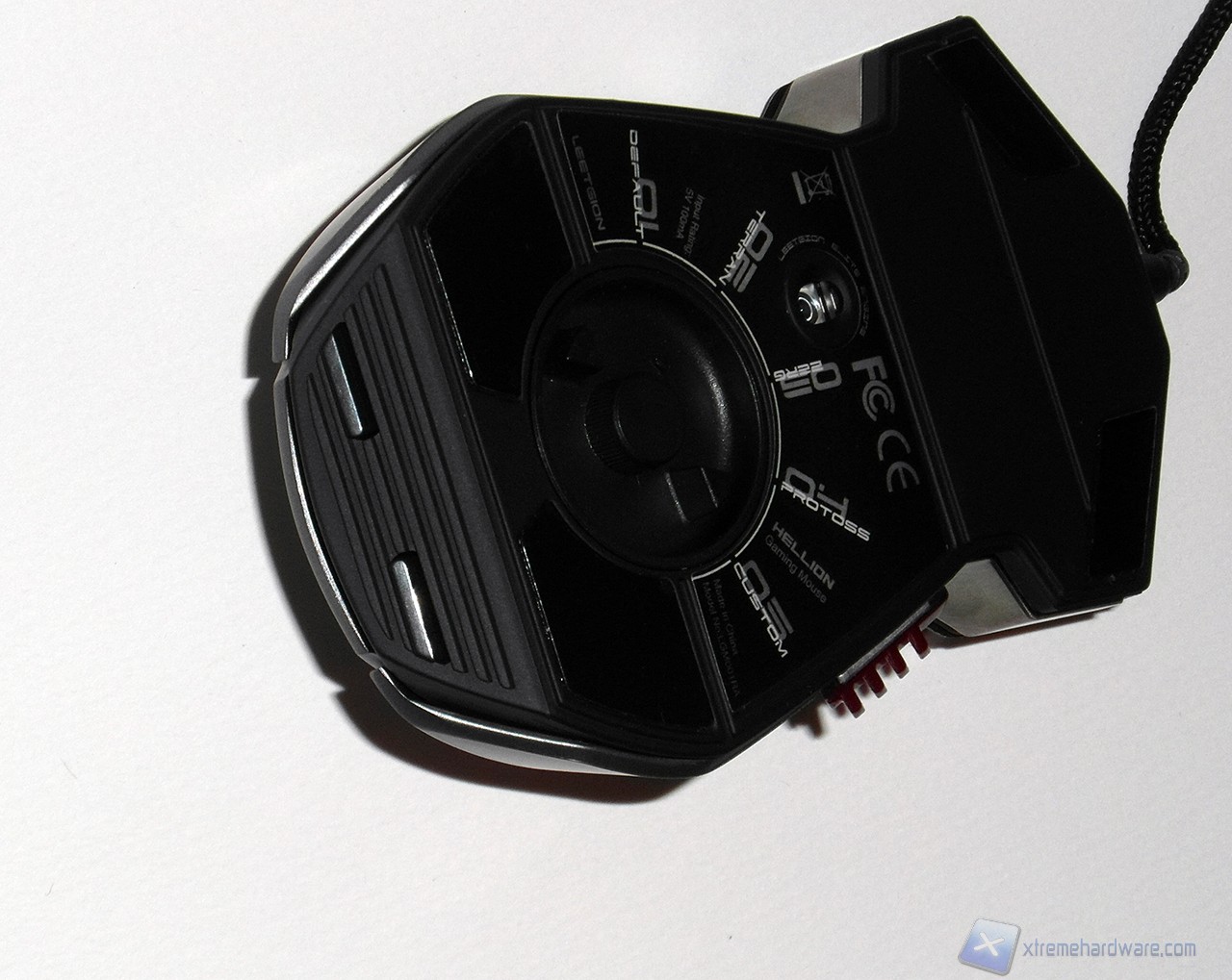 Nella parte posteriore del mouse troviamo i due pulsanti per il cambio della risoluzione del sensore, mentre nella parte inferiore l'enorme manopola per il cambio del profilo domina la superficie, rendendo molto particolare il mouse.