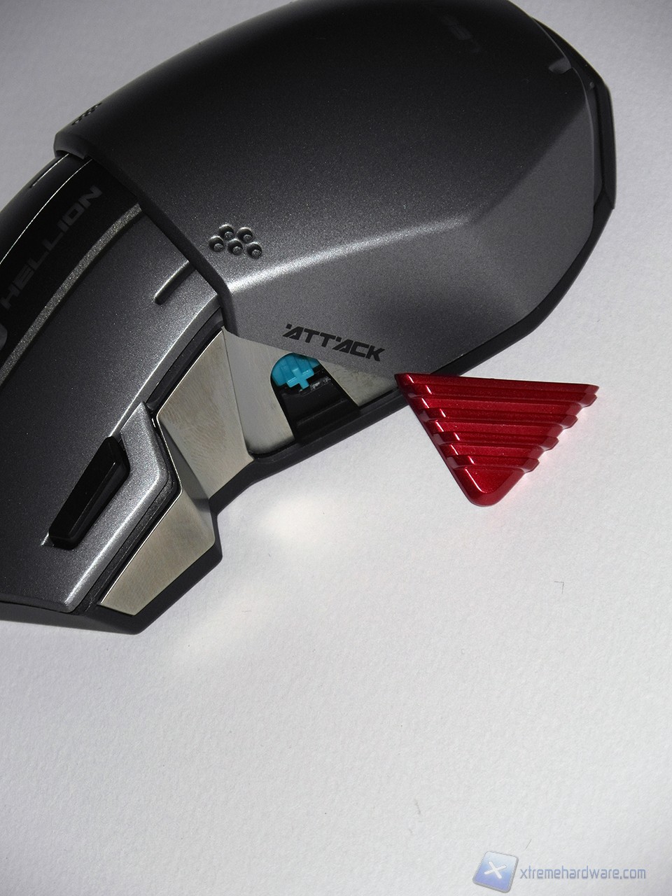 Il lato sinistro del mouse vede la presenza nella parte centrale del grosso pulsante Attack, color rosso metallizzato, che nasconde sotto di esso il Cherry MX Blue. La presenza di uno switch meccanico da tastiera è assolutamente una scelta inedita in un mouse, mai adottata da nessun altro produttore.