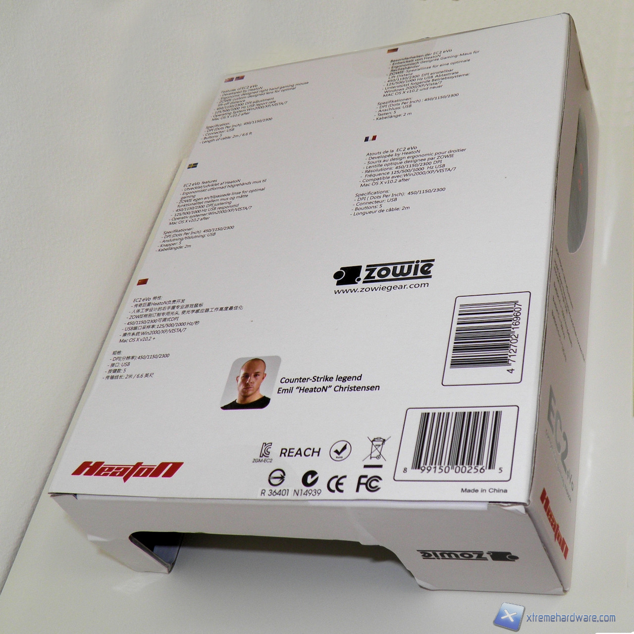 La parte posteriore riporta le informazioni tecniche viste nella pagina precedente, possiamo notare come il mouse sia stato progettato insieme a HeatoN, nome “d’arte” di Emil Christensen, giocatore professionista svedese di CS. Il nome di questa serie di mouse deriva proprio dalle sue iniziali: EC.