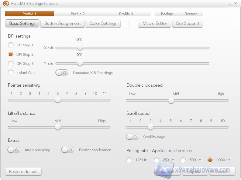 La prima schermata (Basic Settings) è molto completa e avremo la possibilità di personalizzare praticamente ogni funzionalità del mouse. Possiamo variare i DPI, creare tre step di DPI e inoltre abilitare la funzionalità InstantAIM. Inoltre abbiamo la possibilità di variare la sensibilità del puntatore, cambiare il refresh del Polling Rate, la velocità del Doppio Click, quella dello scroll. Come per molti mouse laser di fascia alta è possibile impostare il Lift OFF del mouse, opzione molto importante per alcuni videogiocatori che alzano spesso il mouse dalla superfice di contatto. Ovviamente le variazioni che vengono effettuate devono essere confermate dall’utente e non vengono caricate in automatico nei 512 KB della memoria interna del mouse.