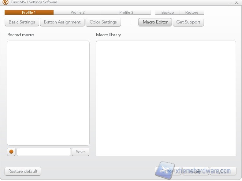 Per finire il pannello di gestione del Func MS-3 ci permetterà di creare sino a tre profili e di salvare o ripristinare le impostazioni che avevamo scelto.