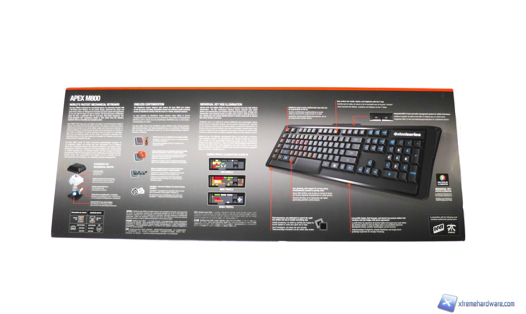 La SteelSeries Apex M800, viste le sue dimensioni ci giungerà in una confezione di cartone con doppio rivestimento per proteggere al meglio il prodotto ed il bundle. Nella parte esterna troviamo al solito immagini illustrative, caratteristiche ed informazioni. Specialmente nel retro troviamo tutte le informazioni necessarie.