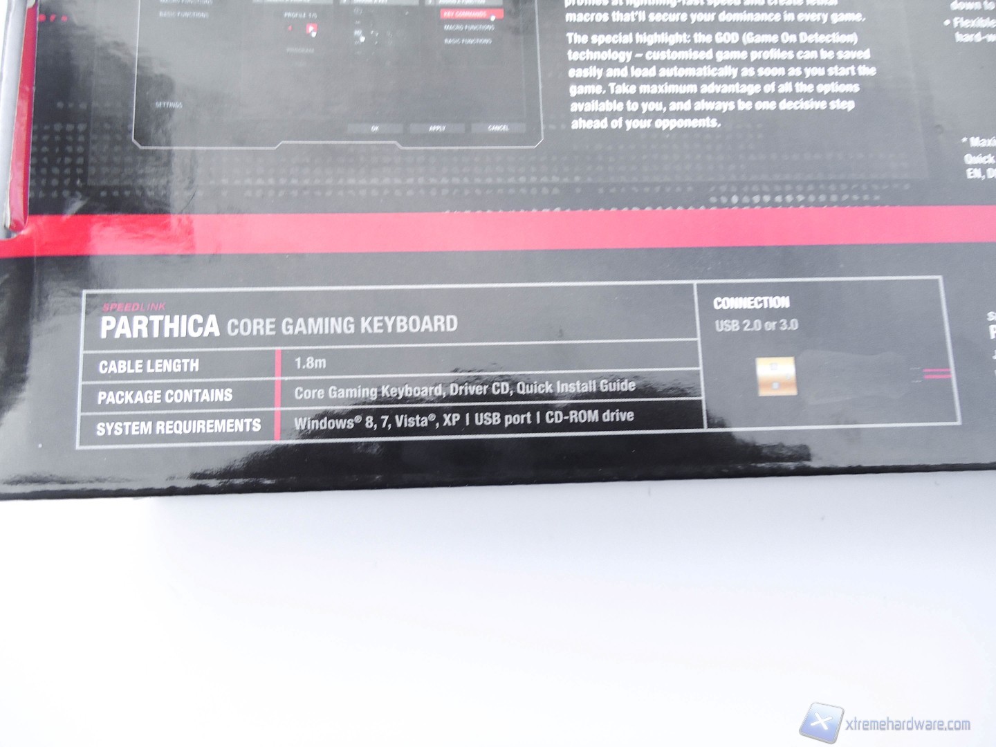 Nella parte posteriore troviamo semplicemente le varie caratteristiche del prodotto scritte in varie lingue tra cui l’italiano, un’altra immagine della tastiera dove ci vengono date le misure della stessa e infine una breve illustrazione della funzione GOD che spiegheremo più avanti.
