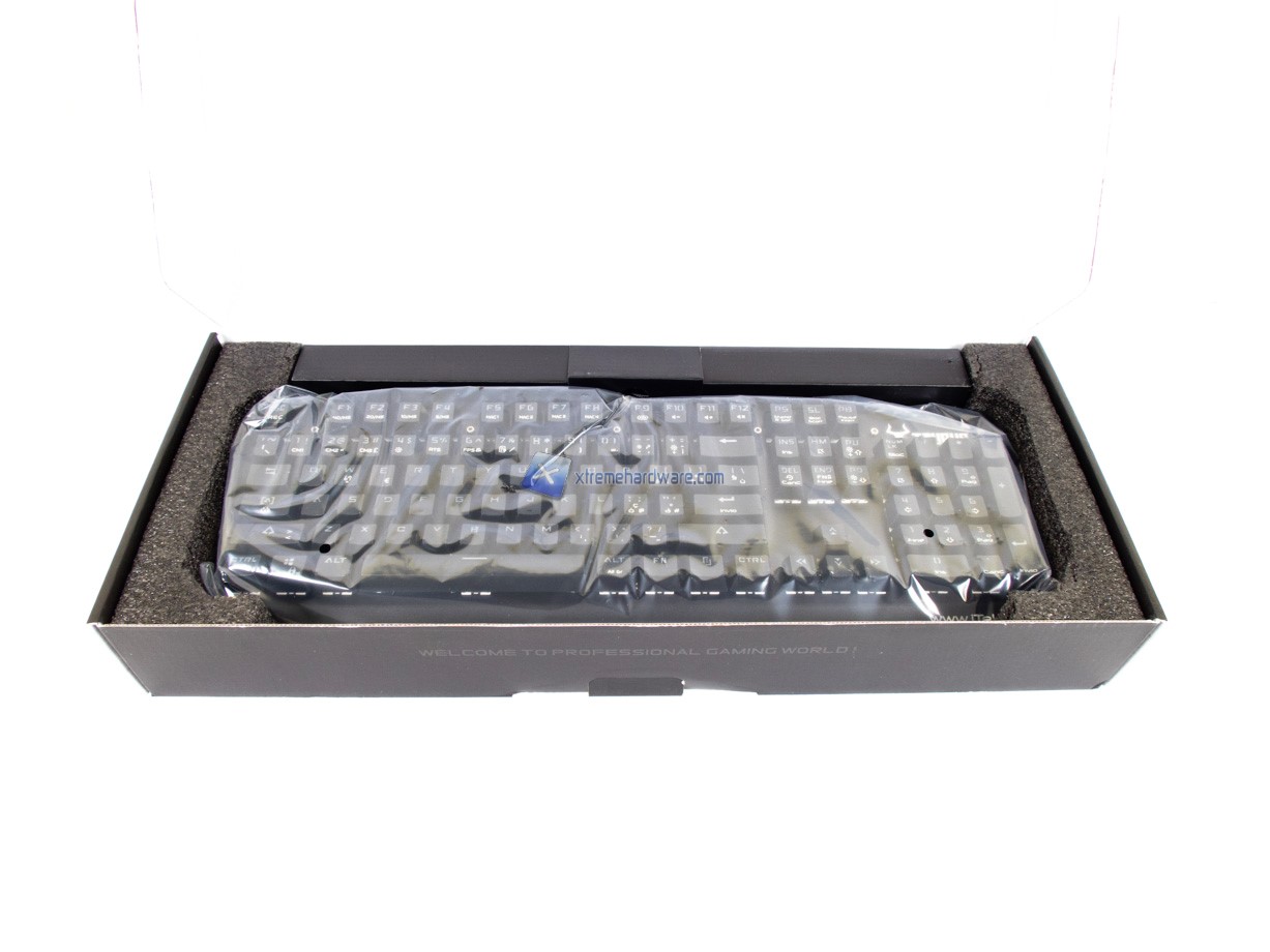 Rimossi i due sigilli in plastica posti nella parte inferiore della confezione potremo aprire la confezione. Troveremo la tastiera ben salda nella confezione grazie a due sagome in polietilene e un inserto di cartone contenente il cavo e parte del bundle.