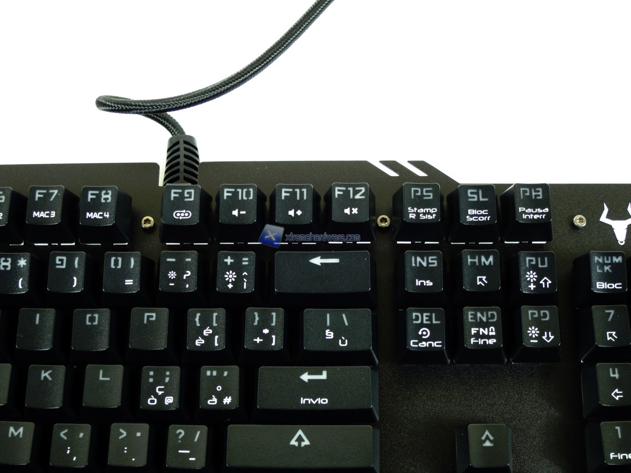 Posta la tastiera frontalmente osserviamo la struttura esposta degli switch meccanici come già visto in altre tastiere meccaniche più famose quale Corsair o Razer. Ciò aiuterà ad irradiare maggiormente la retroilluminazione dei singoli tasti.