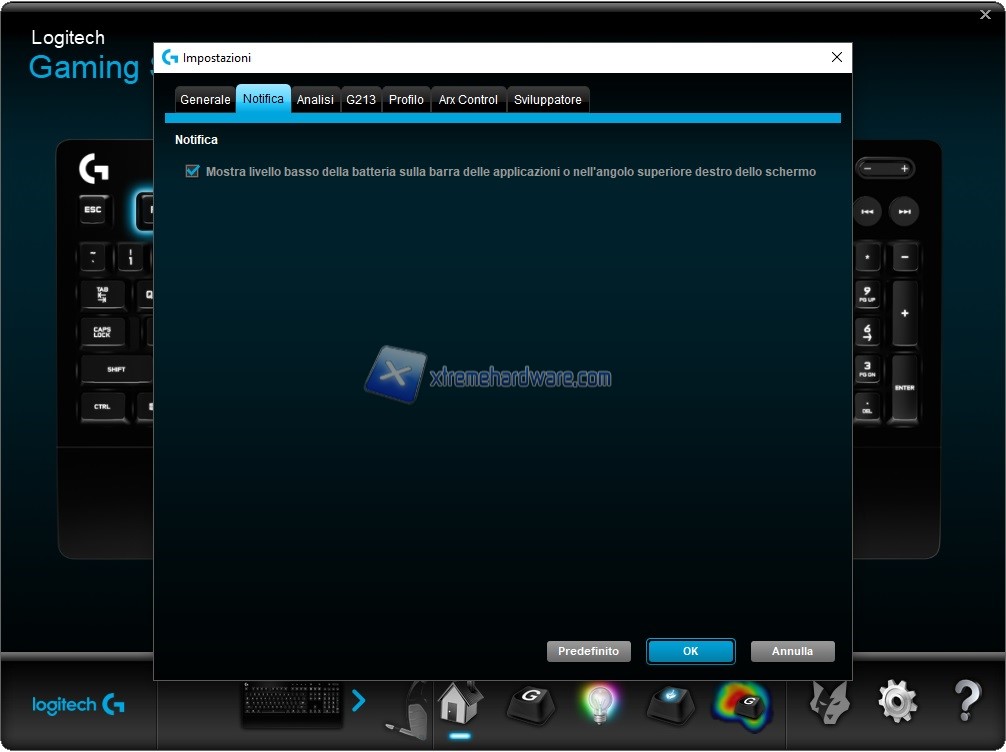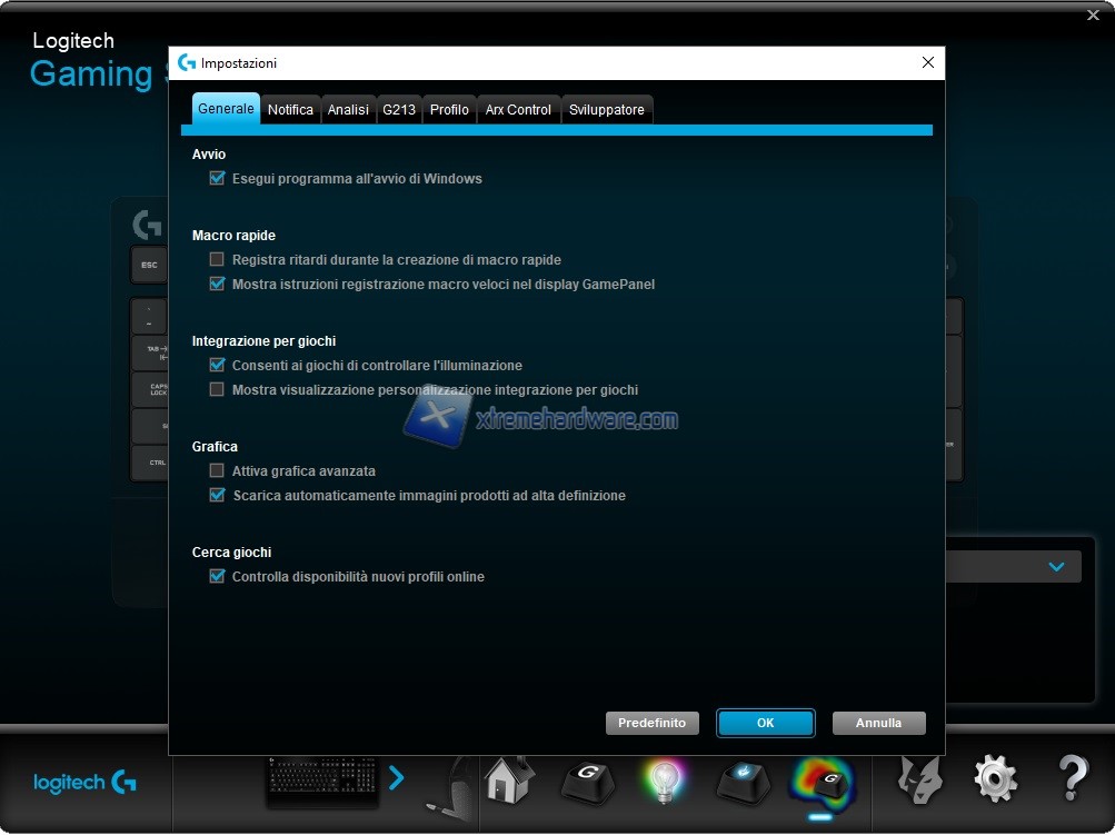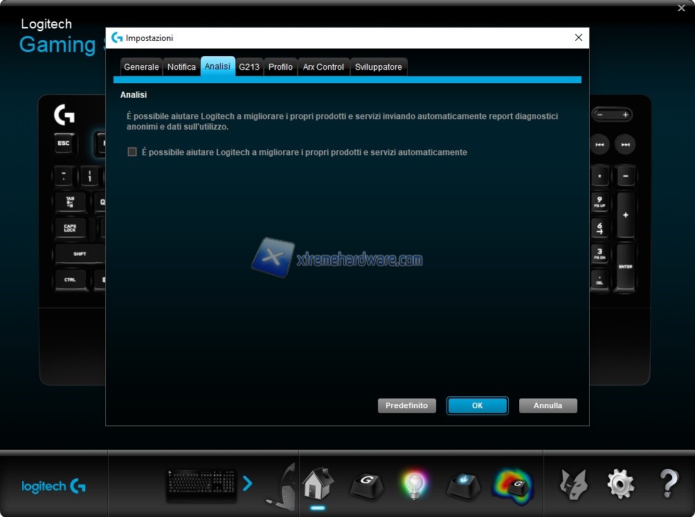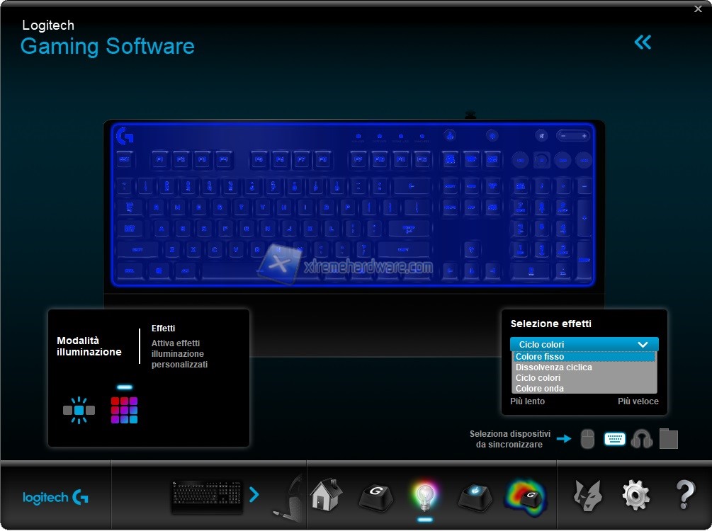 Passiamo all’icona per la personalizzazione della retroilluminazione RGB e relativi effetti. Logitech ci mette a disposizione abbastanza voci per la personalizzazione tra cui la sincronizzazione cromatica tra diverse periferiche compatibili Logitech. La G213 Prodigy inoltre offre un’illuminazione separata delle quattro zone che ci permetteranno di realizzare effetti ‘’bandiera’’ o simili.