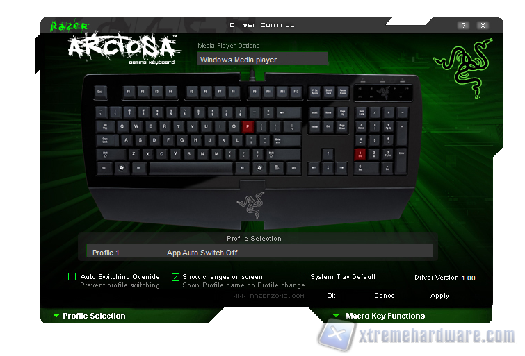I driver si dividono sostanzialmente in due parti, una dedicata alla gestione dei profili (10 in tutto) e una dedicata ai tasti e alle macro generabili, raggiungibili dalle tendine poste nella parte inferiore dell'interfaccia.