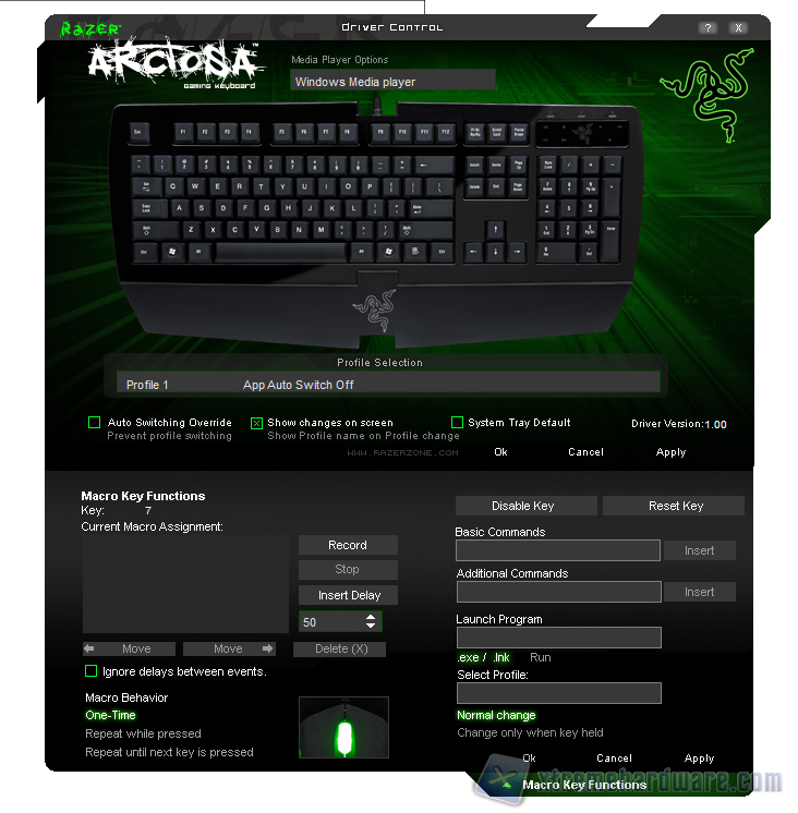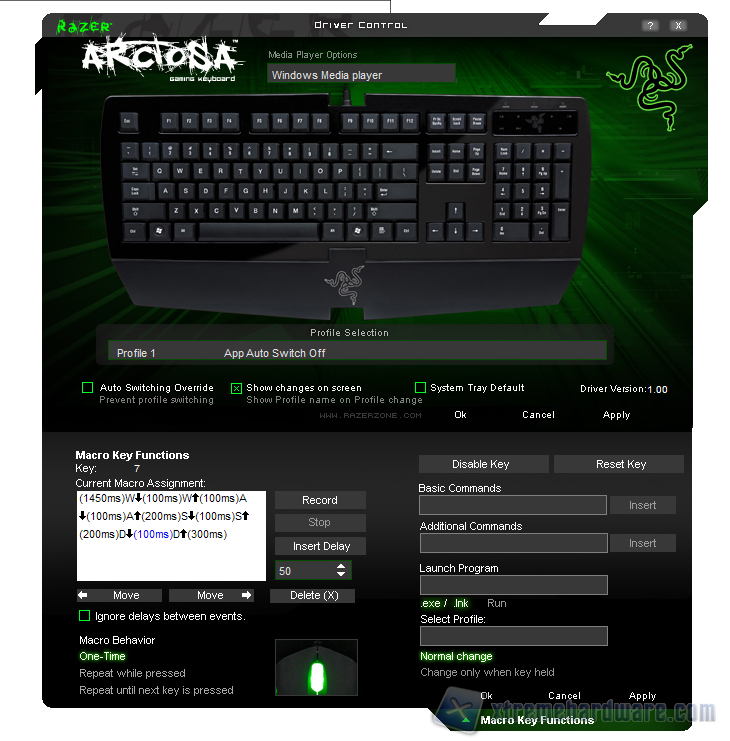 Per ogni tasto è possibile registrare una macro, questo come di consueto avviene premendo il pulsante Record e digitando la sequenza desiderata. Terminata la sequenza è poi possibile editarla, aggiungendo ritardi, muovendo i blocchi o eliminandone alcuni indesiderati. È possibile anche inserire comandi provenienti dal mouse grazie al mouse in basso (l'input non avviene direttamente dal mouse fisico). Come di consueto la macro può essere eseguita una volta (One-Time), n volte fintanto che il tasto è premuto (Repeat while pressed) o n volte fino alla pressione successiva (Repeat until next key is pressed).