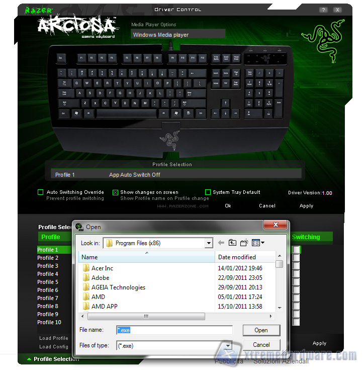 Il menu dedicato ai profili ci permette di configurare 10 profili, è possibile indicare il nome del profilo, l'EXE a cui è associato e se eseguire lo switch automaticamente. In tal modo avviando quel programma partirà in automatico il profilo precedentemente creato.