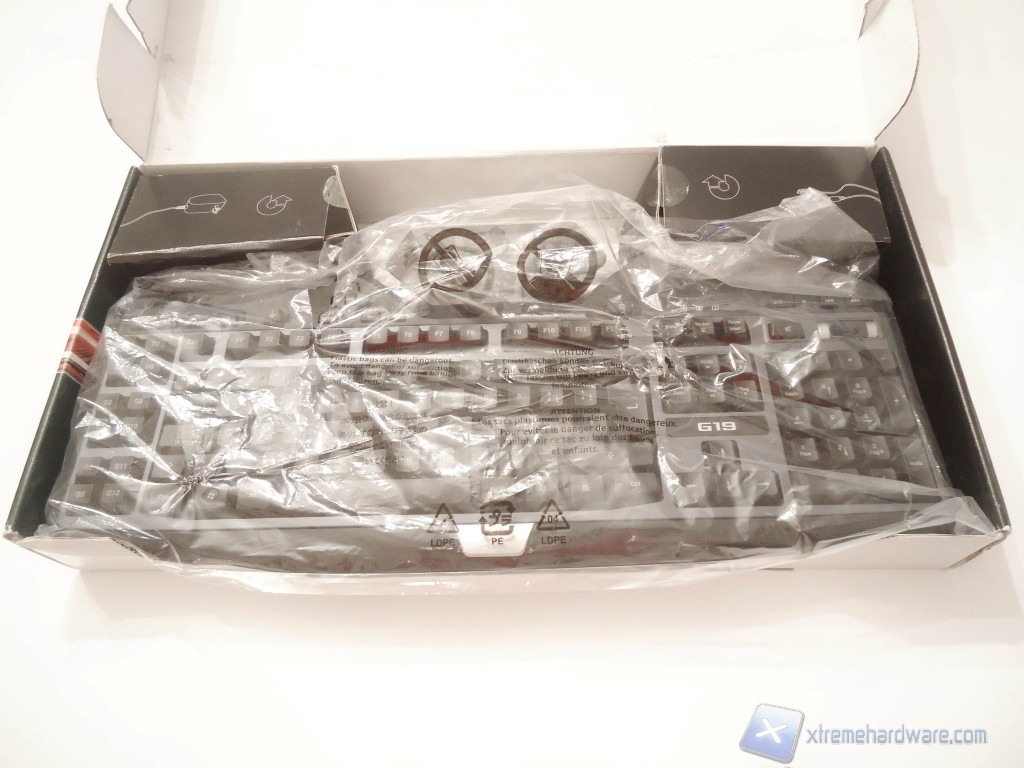 Aprendo la confezione in primo piano troviamo la G19 racchiusa in un involucro di plastica per proteggerla dai graffi. Negli angoli superiori della scatola troviamo due piccoli scompartimenti di cartone dove sono alloggiati rispettivamente alimentatore e cavo USB della tastiera.