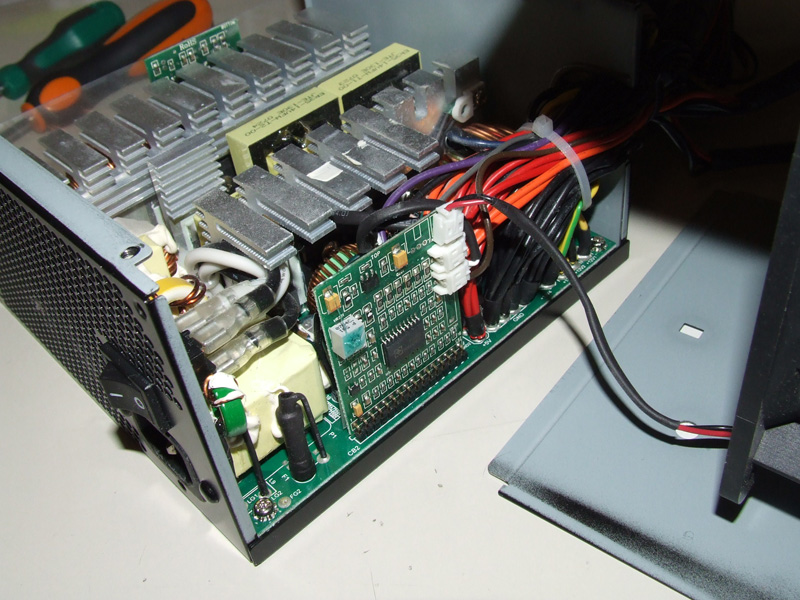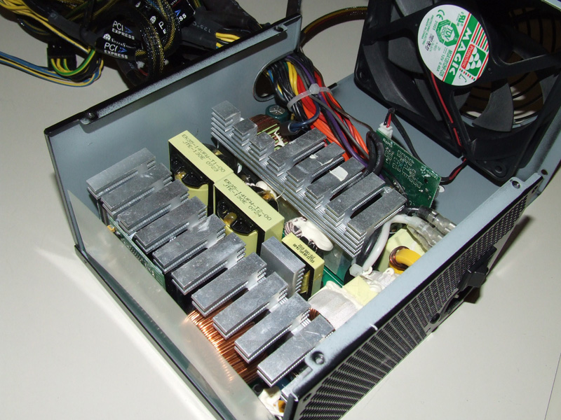InternoL'interno del SilverStone OP700 rispecchia la classica divisione primario-trasformatori-secondario, separati dai dissipatori in alluminio su cui sono fissati mosfet della sezione switching. I componenti utilizzati son di ottima fattura, infatti possiamo notare che tutti i condensatori primari sono giapponesi.