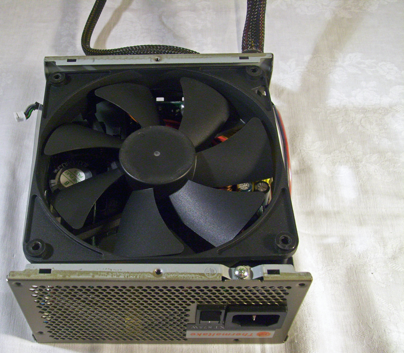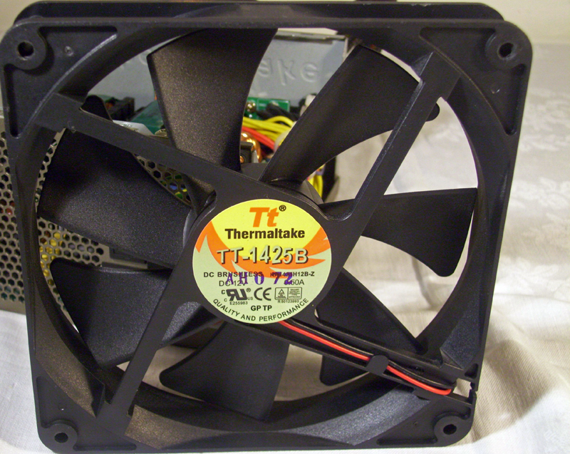L’alimentatore si presenta con una ventola da 140mm, contro i 120mm degli alimentatori più economici, termo controllata e con velocità massima di rotazione di 1900rpm. La sigla della ventola è TT-1425B e il massimo assorbimento è 0.60A.