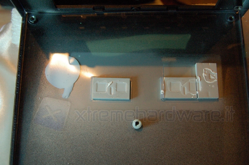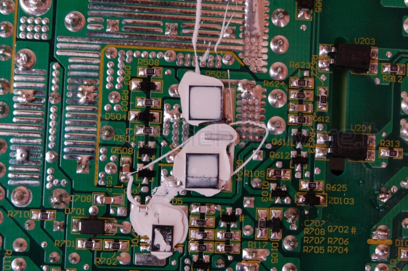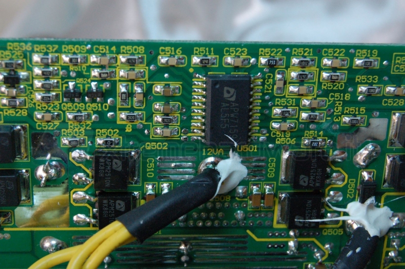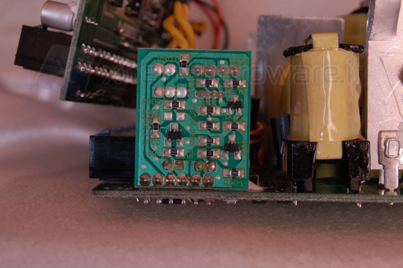 Nell’angolo sinistro del pcb si nota il lato posteriore della piccola scheda predisposta a contenere la circuitazione di controllo PWM della ventola Sanyo, con tre mini integrati a 3pin dedicati alla gestione delle operazioni mentre sul lato anteriore, oltre ad un connettore custom 4poli, è previsto un ulteriore e ben dimensionato condensatore elettrolitico.