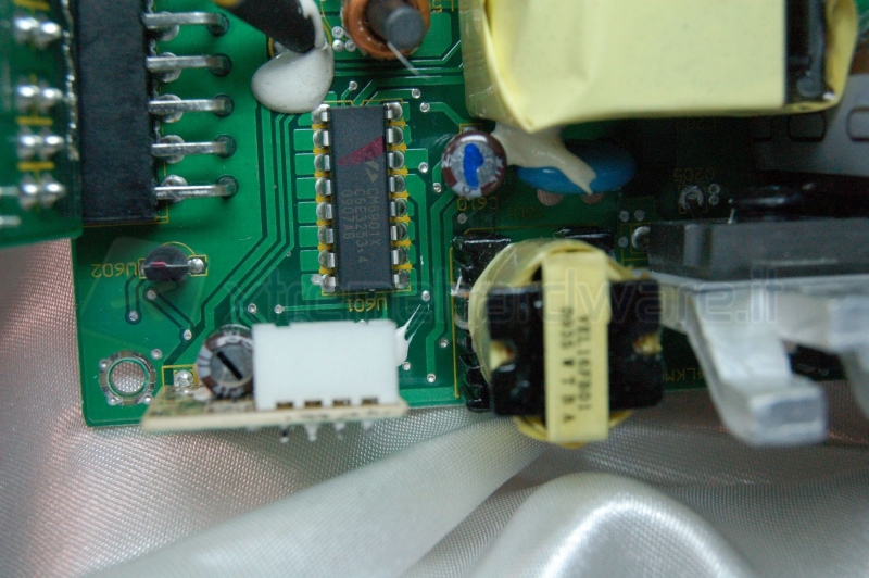 Quella che possiamo intravedere in questa immagine è la piccola scheda ausiliaria predisposta alla gestione e al controllo delle linee a bassa tensione. Le relative operazioni sono portate a termine tramite l’integrato PS223, di produzione SiTI, un circuito integrato a quattro canali per la supervisione ed il controllo dell’attività del secondario, con protezione interna da sovra-temperature.