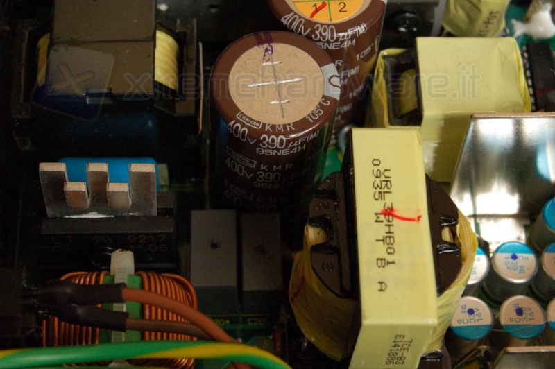 Di seguito possiamo dare uno sguardo ai due imponenti condensatori del primario: sono dei Nippon Chemi-Con (del medesimo produttore giapponese sono del resto tutti gli altri svariati condensatori sparsi all’interno di questa unità) e appaiono anche ben sovradimensionati con 390µF a 400V. Fanno parte della serie KMR, quindi sono di alluminio e di tipologia elettrolitica, con capacità di funzionamento inalterato fino a 105°C.
