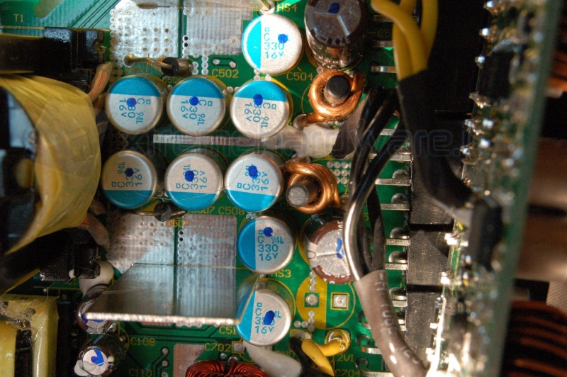 Quello che può, invece, ben notarsi in questa immagine è il dettaglio dell’integrato SLS-SRC/LLC+SR a 16pin CM6901X, un controller risonante prodotto dalla Champion MicroElectronic Corp.: è la vera chicca di questa psu e ne rappresenta realmente il cuore pulsante. Questo IC è capace di operare conversioni DC-DC con rettificazioni sincrone tali da permettere in buona parte al X-750 il raggiungimento del suo davvero elevato fattore di efficienza. E’ in grado, infatti, di cambiare dinamicamente e in tempi estremamente rapidi la modalità di funzionamento da quella FM (in modulazione di frequenza) ai bassi carichi, tramutandola in ben due differenti modalità PWM (in modulazione di ampiezza di impulso) ai medi e agli alti carichi di lavoro. Questa particolarità permette al sistema di ottenere un ottimo e altamente efficiente bilanciamento tra la capacità di mantenere comunque il range di voltaggio in specifica per il più lungo lasso di tempo possibile (a.e. per favorirne il mantenimento durante micro-interruzioni di erogazione di corrente AC) e la possibilità di ottenere contestualmente una alta efficienza funzionale specifica.