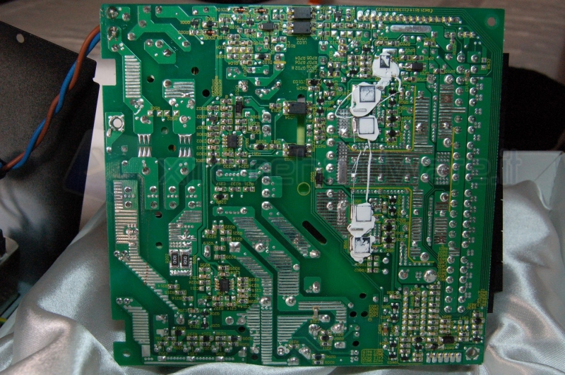 D’altronde, essendo impossibilitata, nella parte inferiore del pcb, l’adozione di dissipatori di alluminio di tipo classico, il raffreddamento di questi MOSFET è ottenuto tramite diretto contatto col telaio dell’unità.