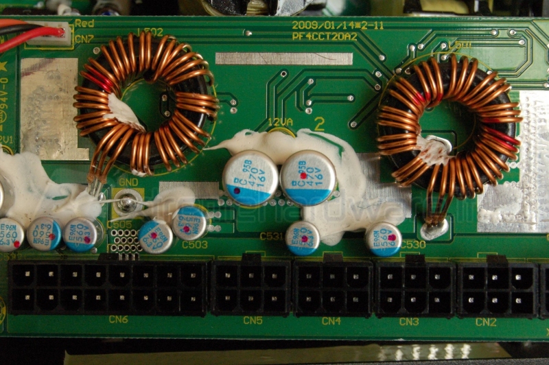 Sul lato opposto della medesima scheda secondaria adibita alla trasformazione in continua delle linee +3.3V e +5V possiamo notare i componenti predisposti alla soppressione dell’eventuale segnale residuo di una componente alternata e/o dei segnali di disturbo indotti dal funzionamento stesso dei regolatori, specialmente in condizioni di pesante carico: in primo piano campeggiano le due relative bobine e i numerosi condensatori metallici Nippon Chemi-Con, Tutti i componenti necessari sono stati inglobati direttamente sul medesimo pcb ospitante i connettori modulari inerenti le due tensioni derivate, mentre la quasi totalità dei connettori +12V e il +5VSB sono direttamente saldati sul pcb principale.