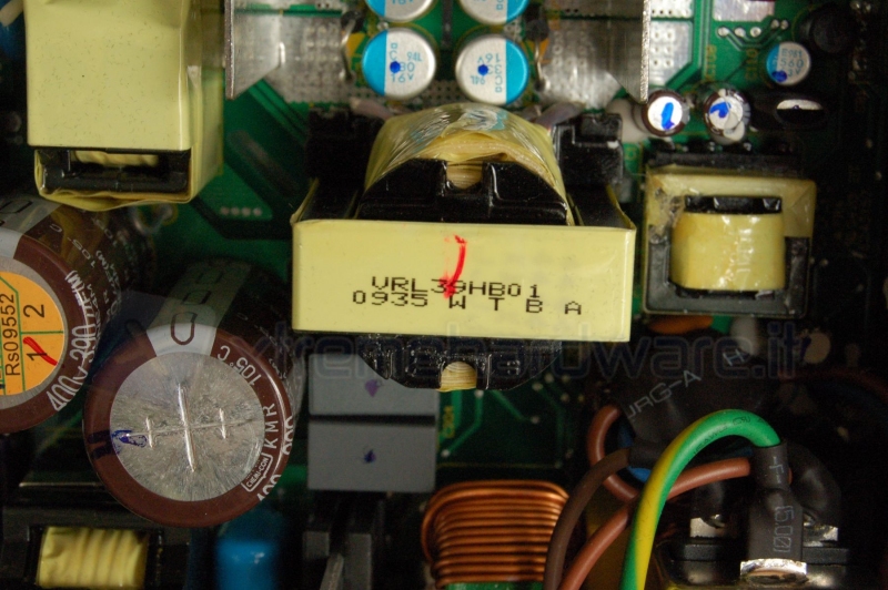 A sinistra possiamo ancora intravedere i due ponti rettificatori e sulla dx il trasformatore primario (VRL 39HB01) col telaio non in lamierini, ma in ferrite privo quindi dei fastidiosi effetti di risonanza, e ancora alla sua dx il piccolo trasformatore dei +5VSB utilizzato nella fase di stand-by dell’unità, anche questo con un più efficace telaio in ferrite.