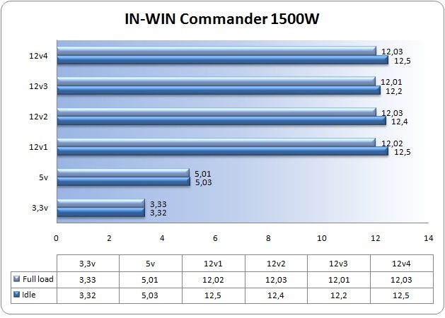 Potete vedere attraverso il grafico sottostante che l'alimentatore in oggetto di questa recensione ha mantenuto valori estremamente eccellenti, in particolare notiamo che su tutte e quattro le linee 12v anche in condizioni di alto stress prestazionale, non ha mai dato valori in eccesso o in difetto, durante infatti l'intero arco dei nostri test ha mostrato voltaggi molto stabili, davvero un ottimo risultato.
