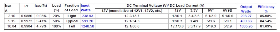 Dai risultati fatti l'efficienza media è del 84.54% sul 50% di carico (uso tipico), mentre arriviamo ad un average del 83.57%, invece con un carico del 20% siamo al 85,08%, sotto pieno carico l'efficienza scende al 81,09%. Queste condizioni di efficienza assegnano il titolo di 80+ compilant.