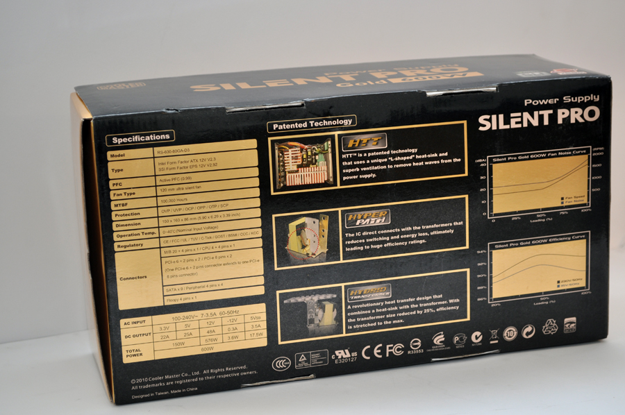 L’alimentatore è racchiuso in una scatola di forma rettangolare di color oro e nero, molto elegante esteticamente, dove sul fronte è impresso il modello e la rinomata certificazione 80 Plus Gold. Sul retro troviamo una tabella con le sue caratteristiche tecniche, amperaggi sulle varie linee e alcune sue tecnologie.