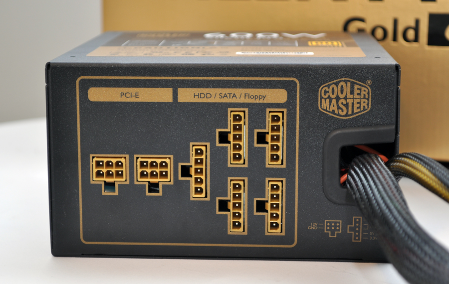 Nella parte alta del telaio troviamo una tabella in cui vengono trascritti gli amperaggi delle varie linee. Nel retro invece troviamo due sezioni distinte per la cavetteria: PCI-E, in cui collegheremo gli eventuali connettori ausiliari della scheda video e HDD/SATA/Floppy per collegare le altre periferiche dotate di quell’attacco.