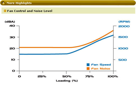Come si può vedere dal grafico sovrastante la ventola non è eccessivamente rumorosa fino al 75% di carico circa, che equivale a 450W, aumentando il suo carico la ventola inizia a farsi sentire. Rispetto ad altre soluzioni presenti sul mercato possiamo dire che la ventola in dotazione risulta essere abbastanza silenziosa.