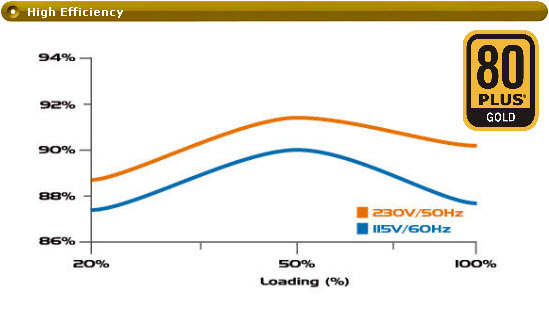 L’alimentatore in questione è riuscito ad ambire alla famosa certificazione 80 Plus Gold. Raggiungendo un’efficienza superiore al 90%. Il Cooler Master, come si può vedere dal grafico, a basso carico si comporta egregiamente, mentre in full-load ha un ottimo rendimento.