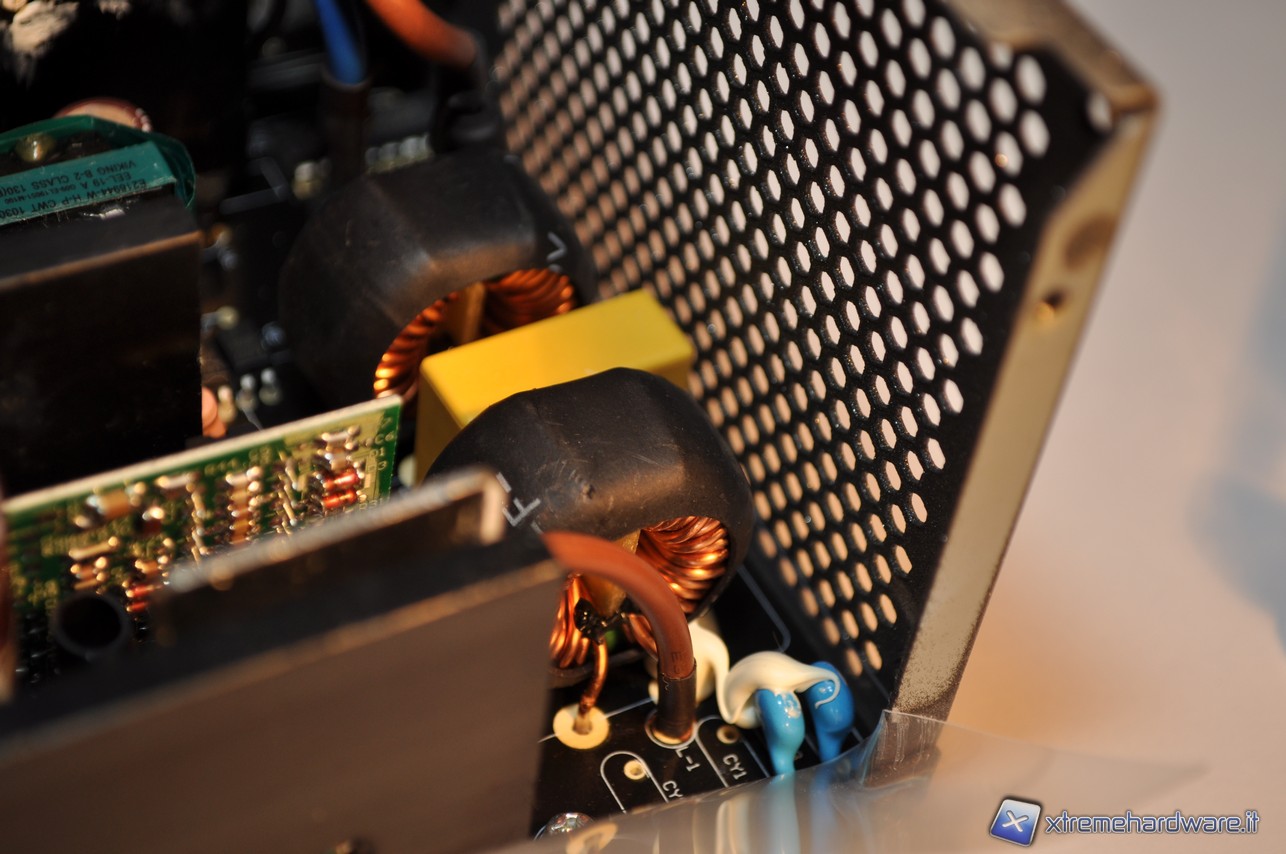 Il filtro EMI ha lo scopo di limitare la trasmissione di armoniche ad alta frequenza dell’alimentatore alla linea di distribuzione dell’energia elettrica e di evitare che i disturbi ad alta frequenza provenienti dalla rete creino dei danni all’alimentatore. Nell’immagine sovrastante è possibile notare sulla destra un altro filtro EMI.