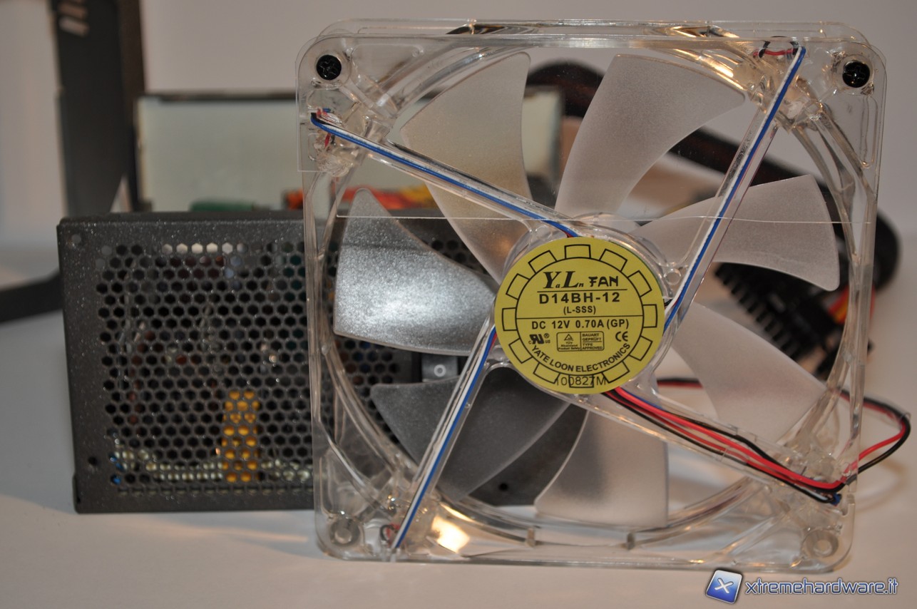 La ventola presente nell’HM-850 è una YaLn D14BH-12 operante con una tensione fino a 12V per un assorbimento massimo di 0.70A. È dotata di 3 led che cambiano colore in base al carico dell’alimentatore: