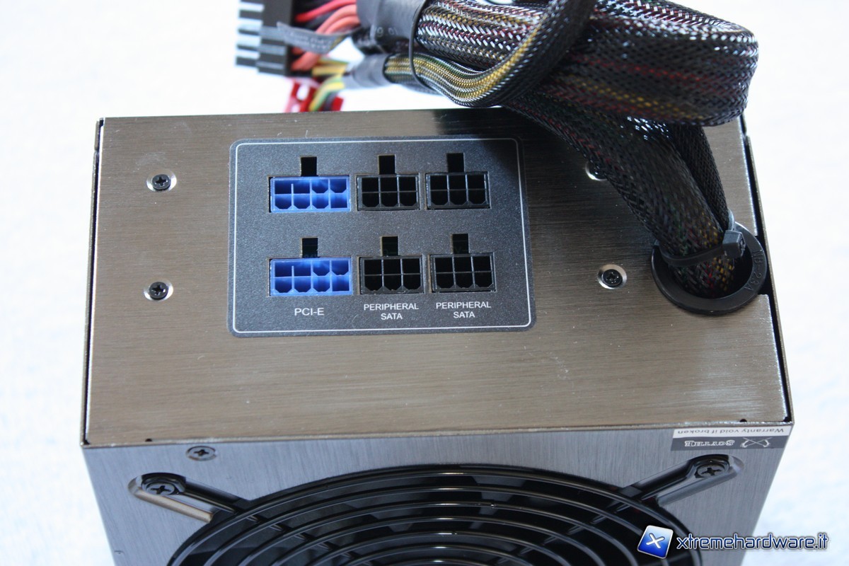 Nella zona posteriore sono presenti i connettori per i cavi modulari: quelli per i cavi PCI-E hanno una colorazione blu, mentre quelli per i molex ed i connettori Sata hanno una colorazione nera.