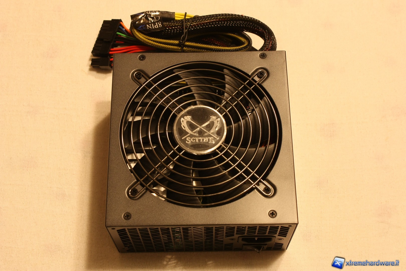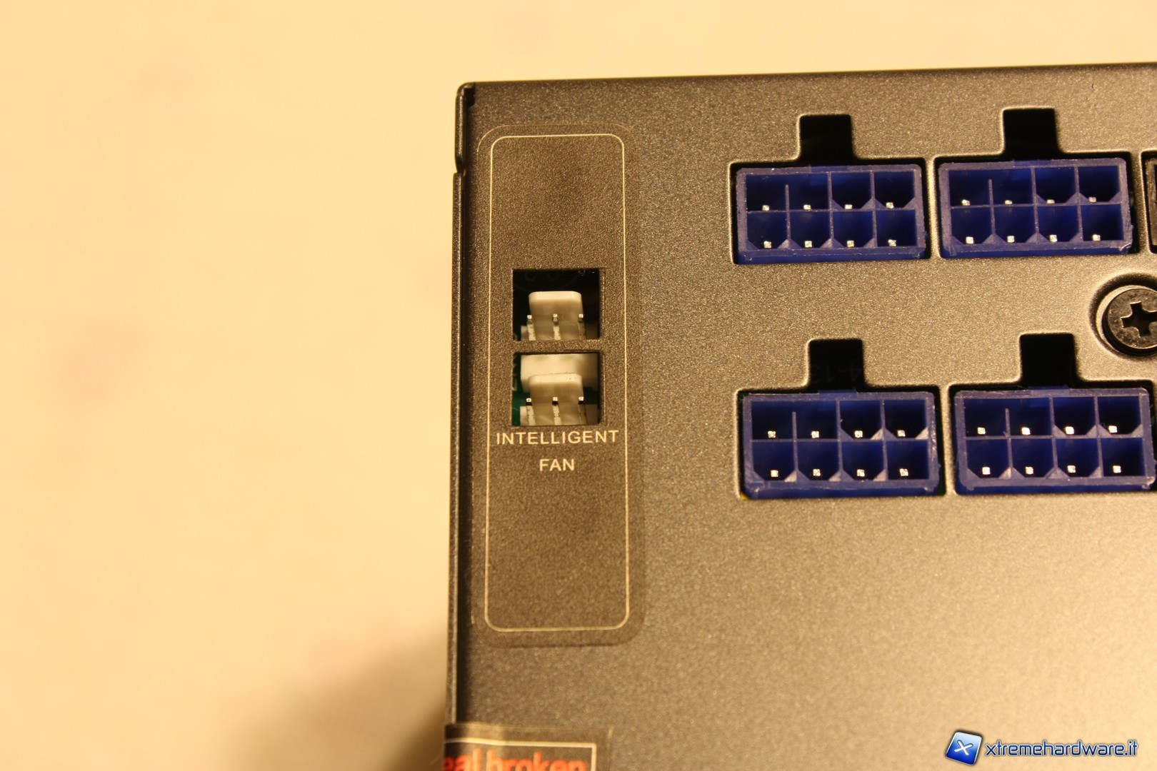 Nella parte anteriore sono presenti i connettori per i cavi modulari. Gli ingressi per i cavi PCI-E hanno una colorazione blu, mentre per i connettori Molex e Sata è stata adottata una colorazione nera; a fianco dei connettori PCI-E vi sono gli ingressi per i connettori delle due ventole da 3pin, completamente termoregolate dal nostro alimentatore.