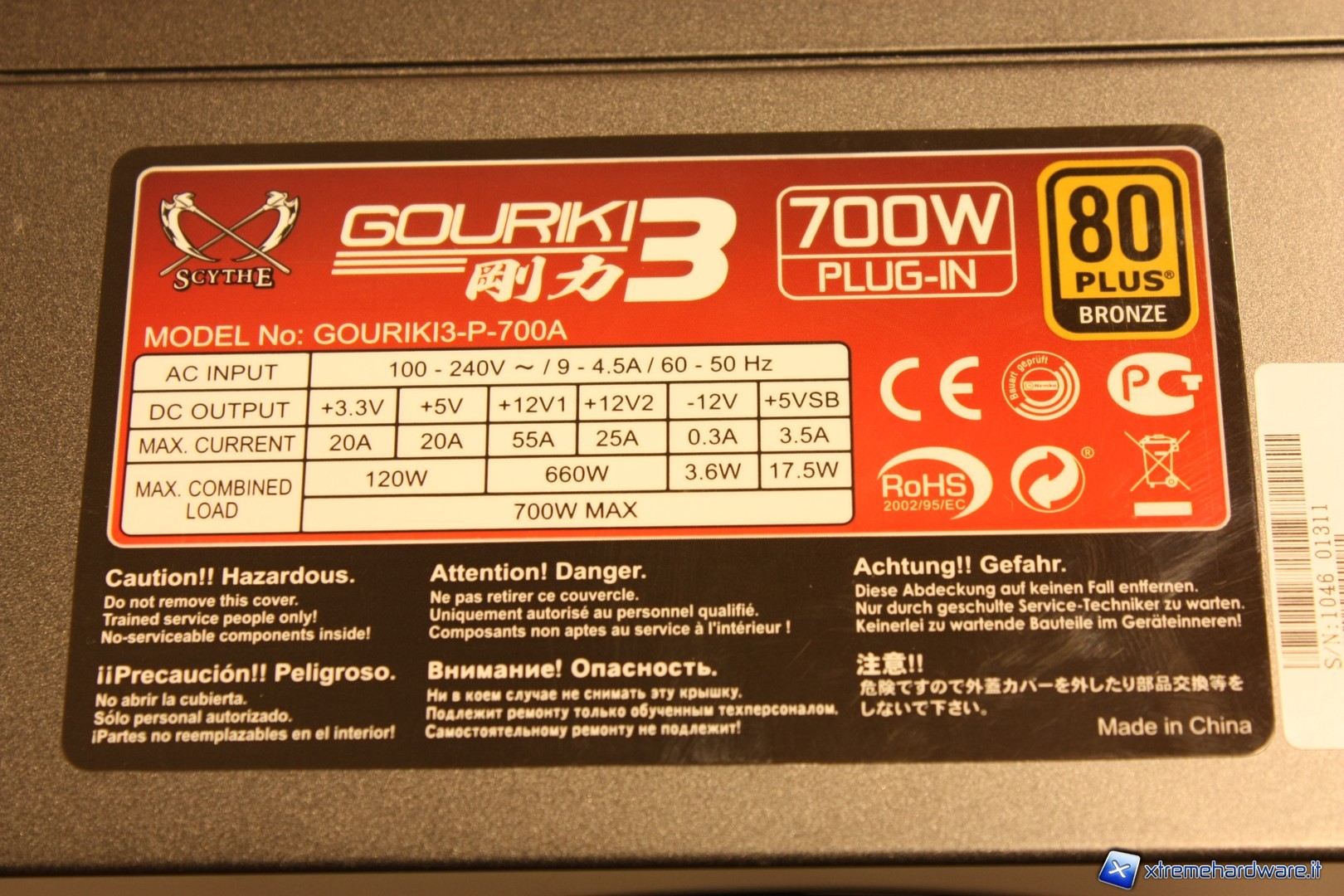 Nella sezione laterale è applicato l'adesivo riportante le informazioni riguardanti gli amperaggi del PSU.