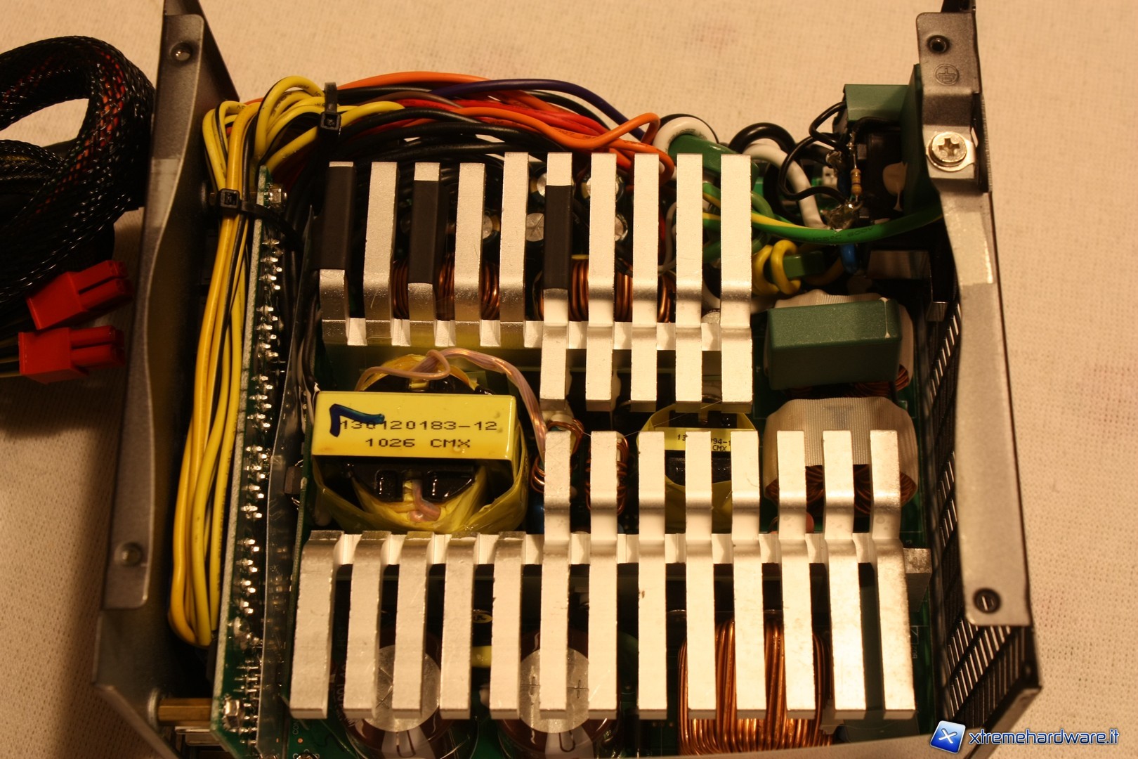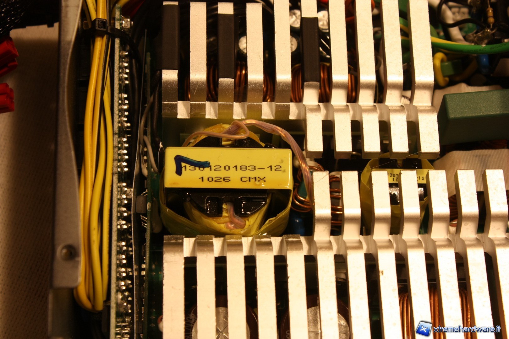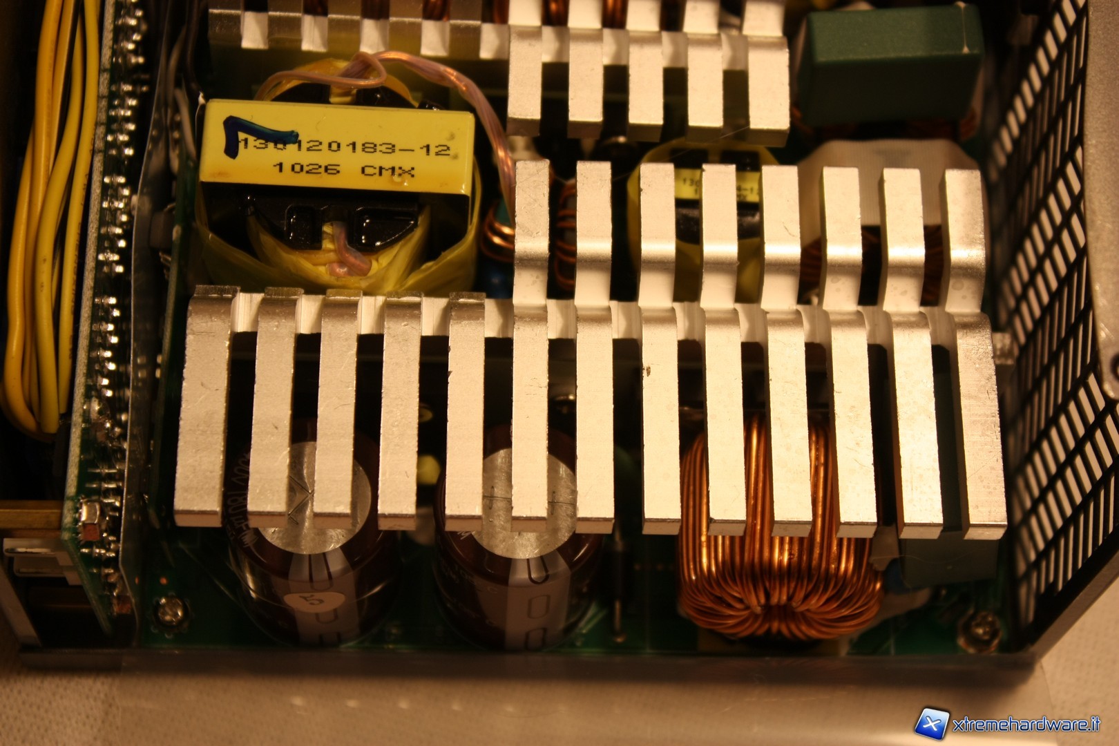A fianco troviamo le due sezioni di switching con i mosfet attaccati ad un dissipatore di alluminio di dimensioni non eccessive, segno che l’efficienza di questo prodotto permette di utilizzare un sistema di dissipazione silenzioso, grazie alla poca quantità di energia sprecata sotto forma di calore.