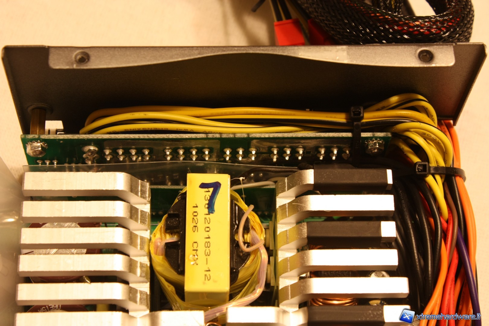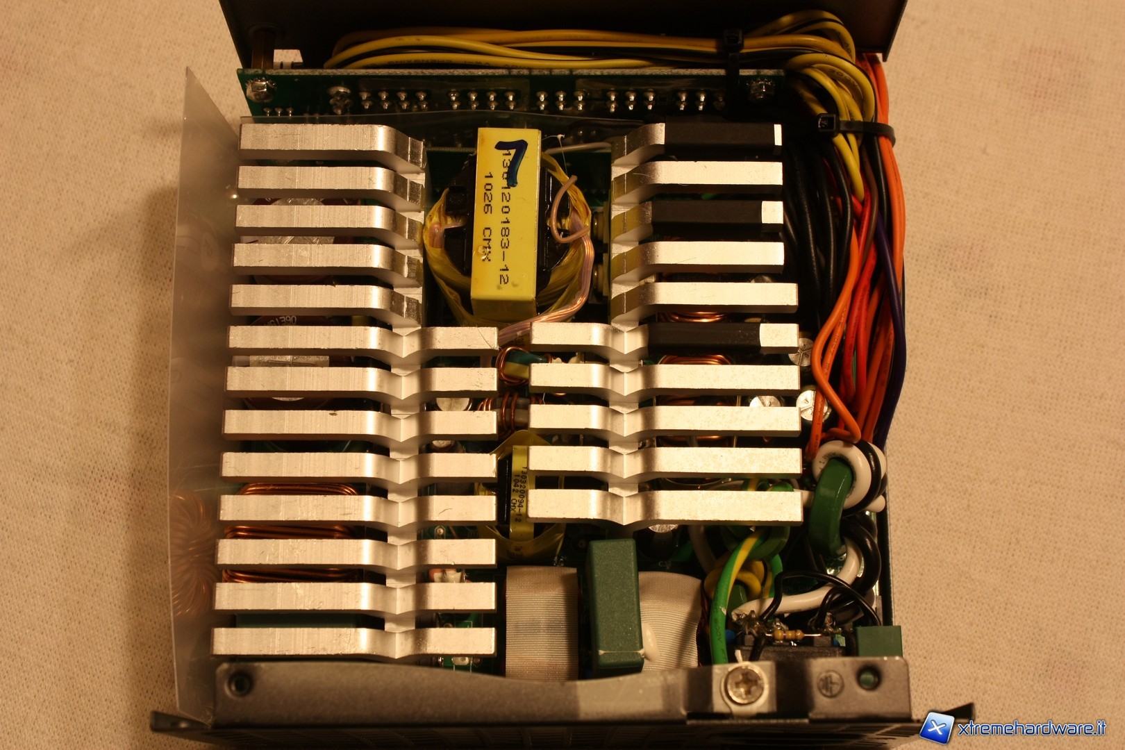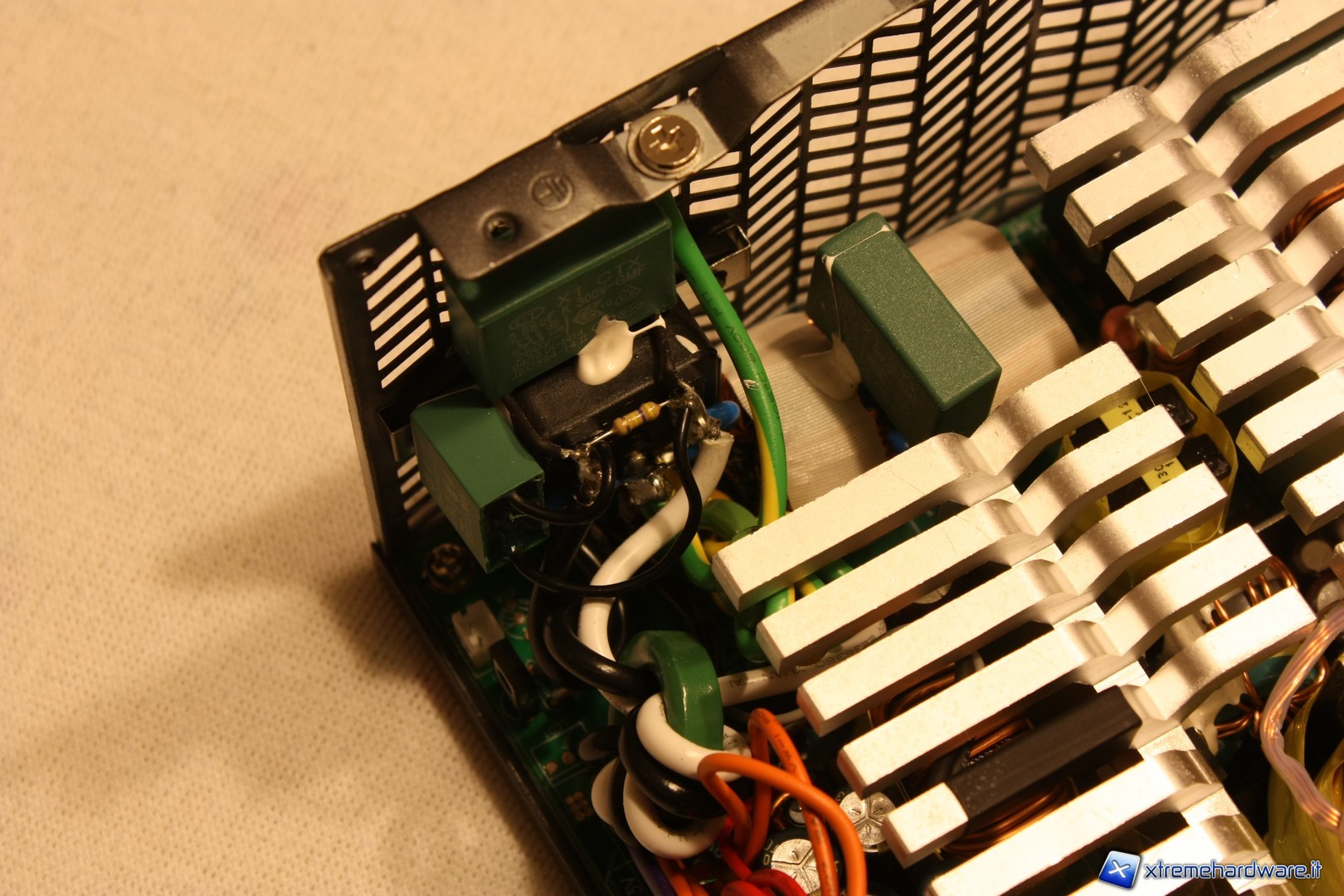 Separate da un foglio di plastica schermato, troviamo il PCB dove sono montati i connettori moodulari e la scheda dedicata al PFC e controllo PWM. Questa zona, insieme a quella di bassa tensione è piuttosto compatta e mostra la difficoltà di realizzare un alimentatore modulare di questa potenza in uno spazio così ristretto.