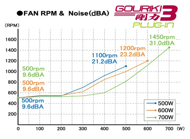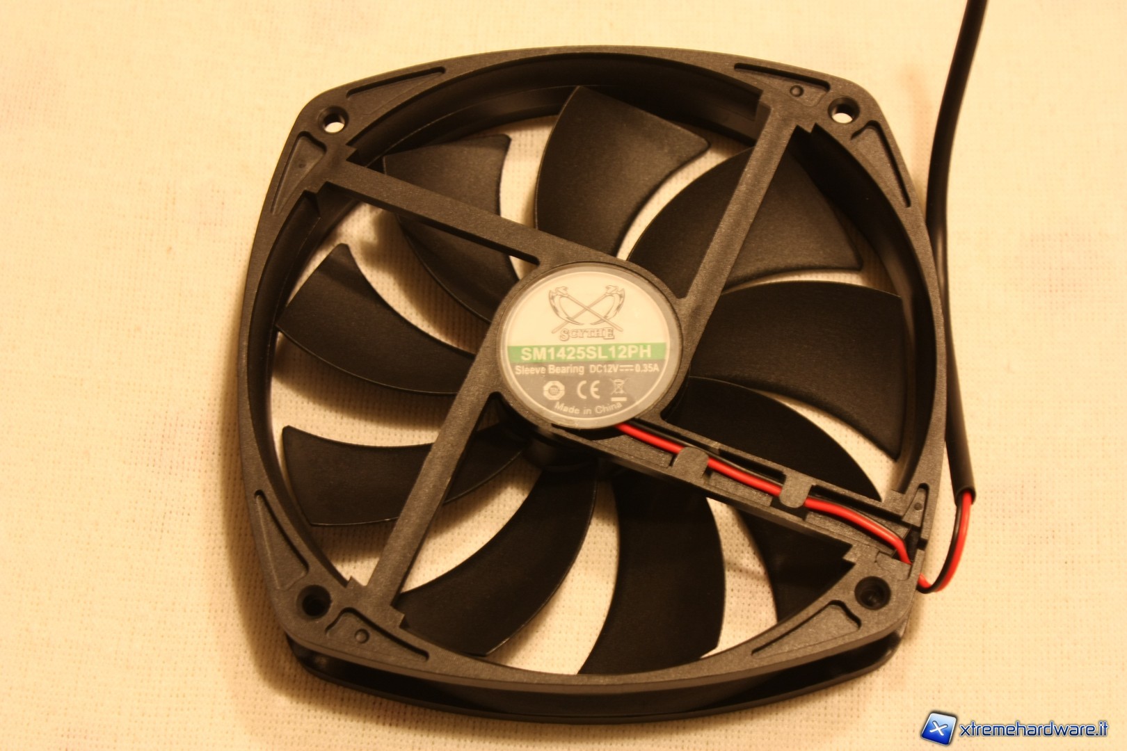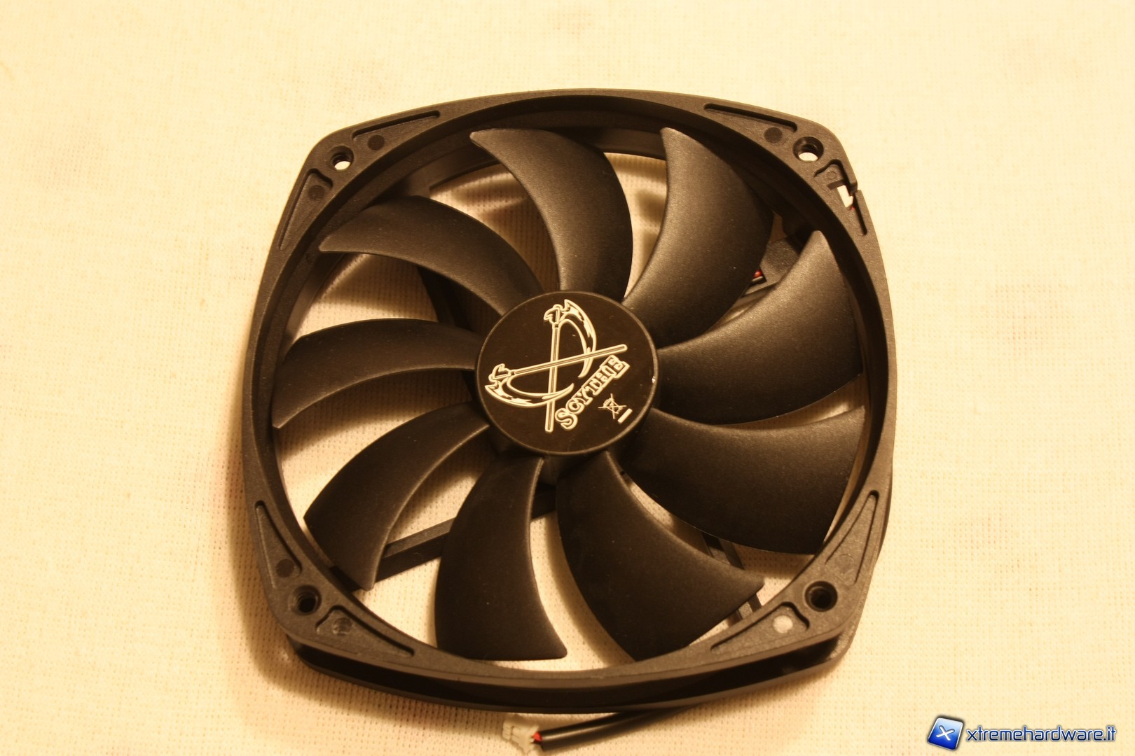 La ventola che equipaggerà il nostro alimentatore è una Scythe Slip stream da 140mm termo-controllata, con un regime di rotazione massimo di 1.450rpm e rumorosità che varia da 9 ai 31 dB (A), la suddetta ventola è istallata anche negli altri alimentatori della linea Gouriki III. Facciamo notare l’estrema silenziosità di questa ventola fino a carichi di esercizio di circa 550W, ovvero praticamente tutte le configurazioni a singola scheda video.