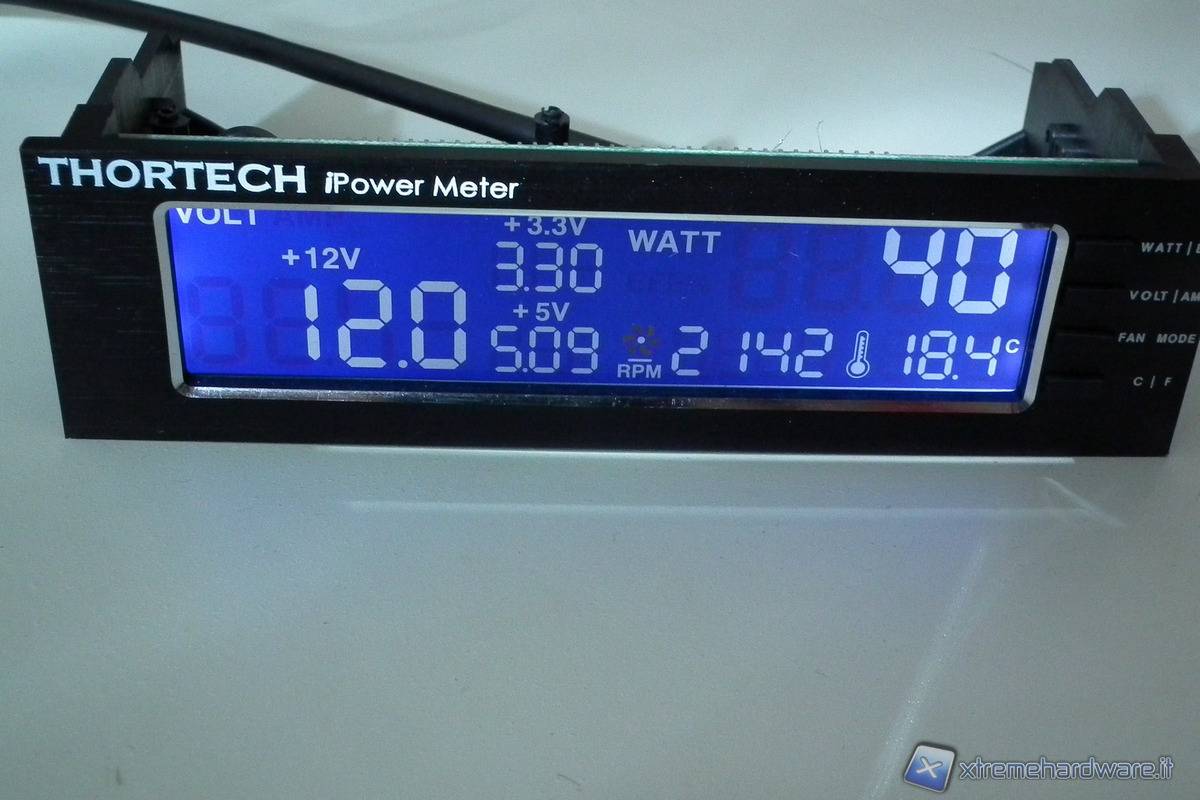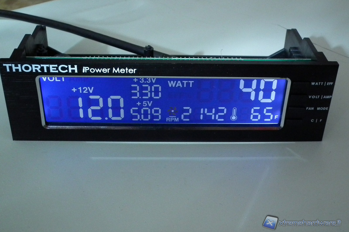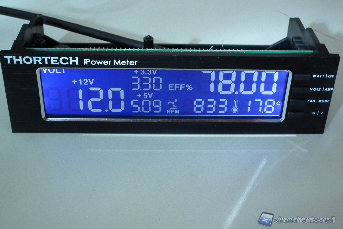 Di seguito vi mostriamo alcune immagini dell’iPower Meter in funzione. Da notare che nonostante il consumo di soli 40W (pari al 5% del carico massimo dell’alimentatore), l’efficienza misurata dell’alimentatore è addirittura del 78%. Generalmente con carichi così bassi gli alimentatori mostrano efficienze ben inferiori. Il Thunderbolt Plus 800 si dimostra quindi ideale anche per quei sistemi in cui il carico di lavoro è notevolmente inferiore alla potenza massima erogabile.
