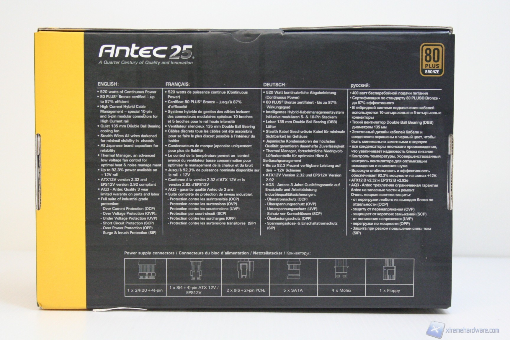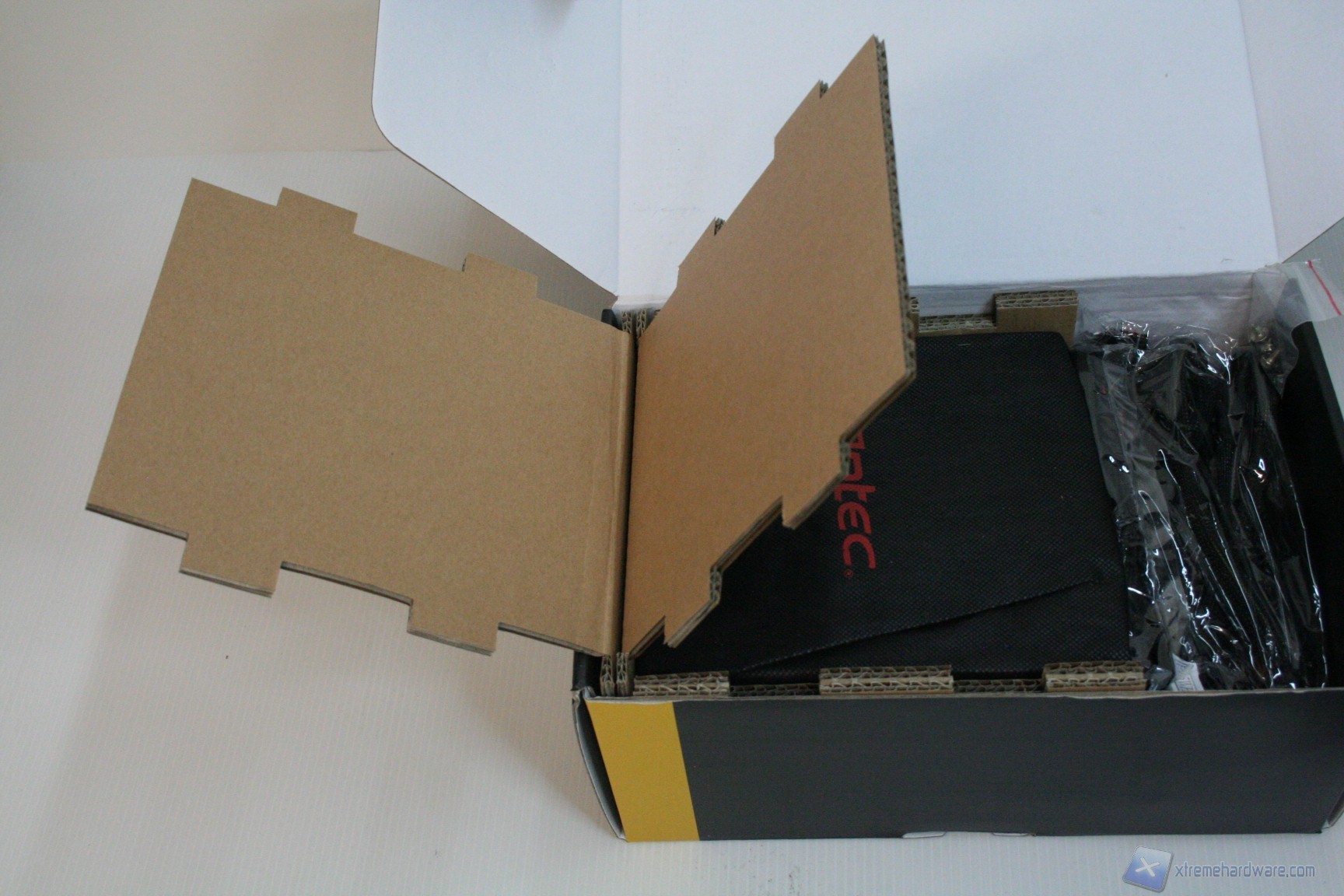 Non ci dilunghiamo molto sulla confezione esterna in quanto le immagini sono particolarmente esplicative; ad ogni modo facciamo presente che il numero delle informazioni, per un prodotto simile, è decisamente sopra la media, come da consuetudine Antec. L’imballo è più che soddisfacente e l’organizzazione interna ottima, similmente all’altro alimentatore HCP-850. Vi mostriamo le foto dirette: