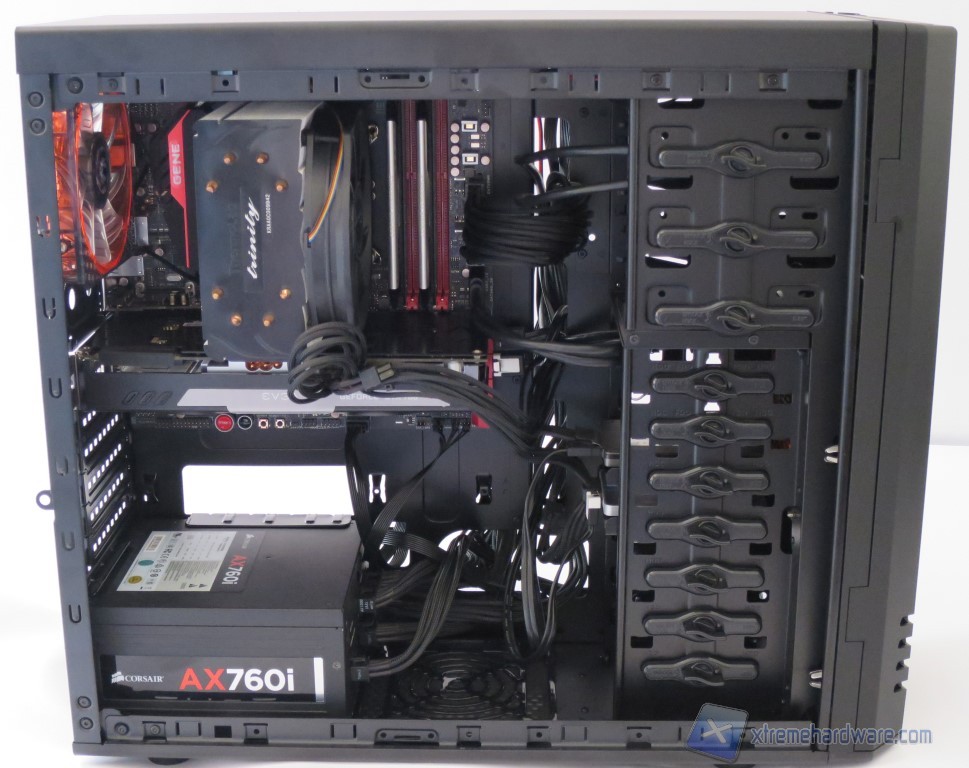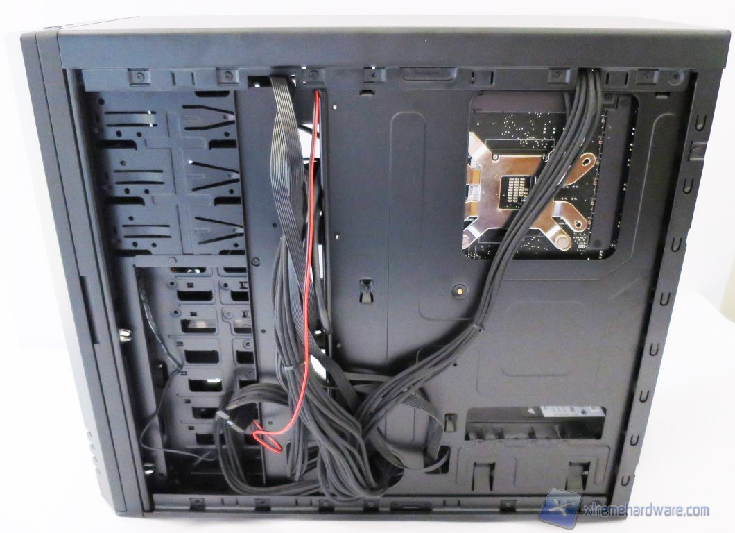 In questo paragrafo analizzeremo velocemente il montaggio di un sistema Intel ed il conseguente cablaggio posteriore ed anteriore. Anche per gli utenti poco esperti la procedura è molto facile: per prima cosa dovrete montare l’alimentatore alla base del cabinet, facendo attenzione a passare il connettore di alimentazione della scheda madre attraverso il retro del case insieme anche a quello ausiliario EPS ad 8pin. Nel caso il nostro alimentatore non abbia cavi abbastanza lunghi possiamo optare sempre per delle prolunghe. Fatto questo, consigliamo l’installazione della scheda madre con relativo dissipatore montato e successivamente della scheda video. Successivamente inseriamo i cestelli con gli SSD/Hard Disk precedentemente montati e colleghiamo il tutto.